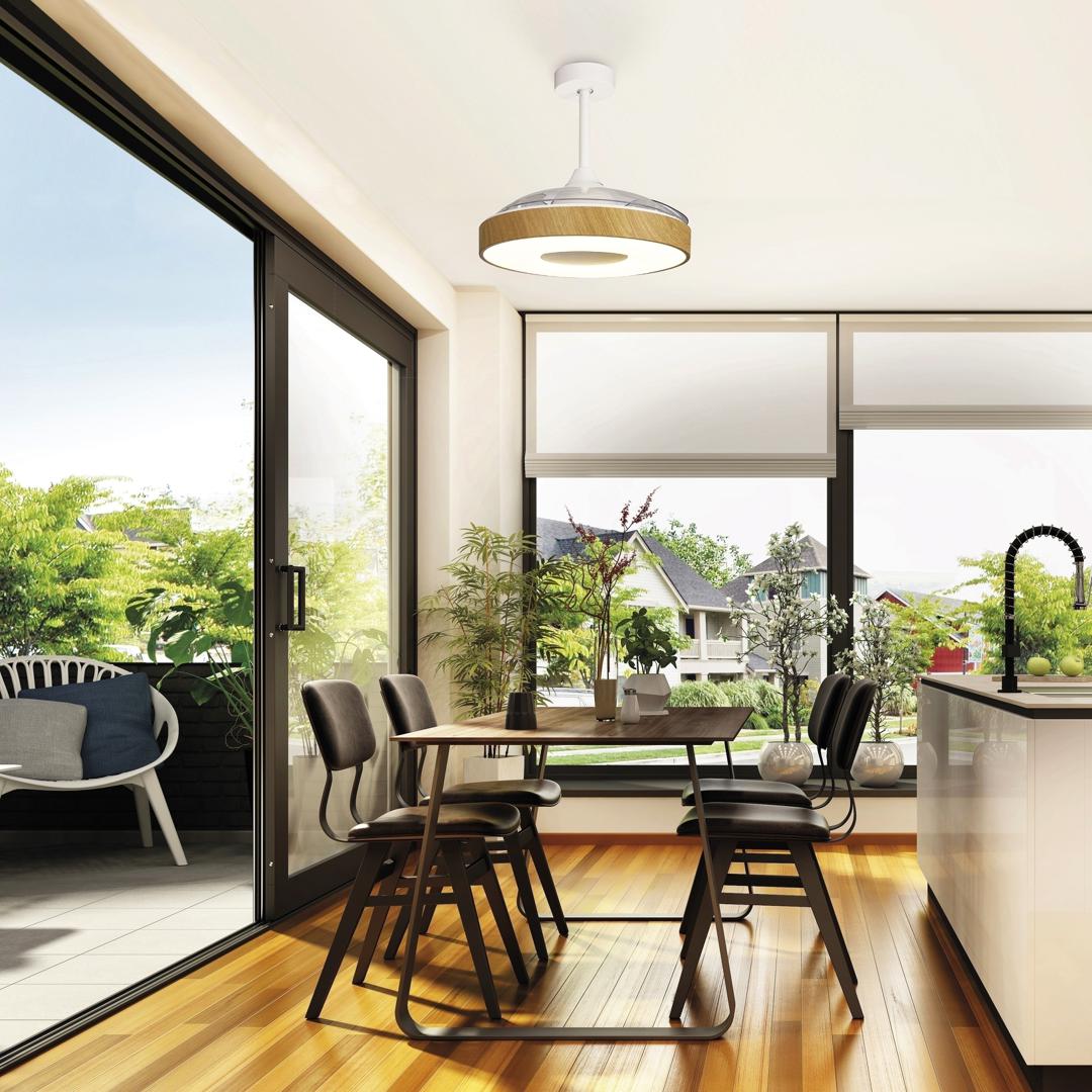 COIN FAN - это коллекция универсальных круглых светодиодных светильников с функцией дистанционного управления и регулировкой высоты. Главной особенностью данной коллекции являются трансформирующиеся лопасти вентилятора, которые раскрываются над светильником. С помощью пульта пользователь может управлять яркостью и цветовой температурой освещения, скоростью вращения вентилятора, а также открывать или закрывать лопасти. Каждый светильник коллекции способен менять свою цветовую температуру от 2700к до 5000К. Такая свобода в использовании дает возможность менять настроение и образ комнаты с помощью пары движений. Светильники COIN станут идеальным световым решением для просторных комнат, которые служат для ряда различных функций, например, как рабочее пространство днем и зона отдыха вечером. Лаконичный дизайн коллекции впишется в широкий спектр интерьеров от кухни до офиса. Светильники доступны в трех цветовых вариантах: белый, черный, эффект дерева, а также в двух диаметрах. Разнообразие отделки позволяет подобрать наиболее подходящий вариант для вашего интерьера.