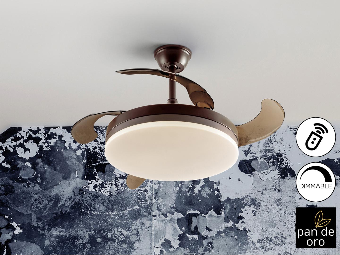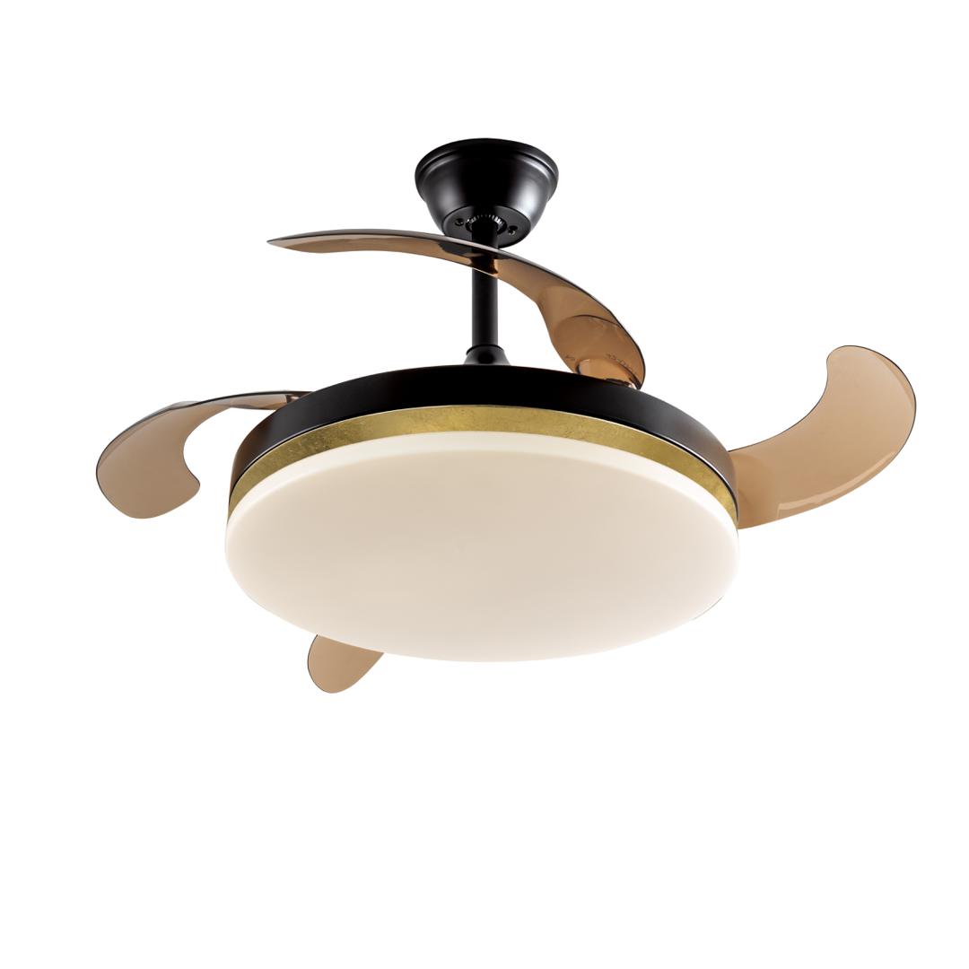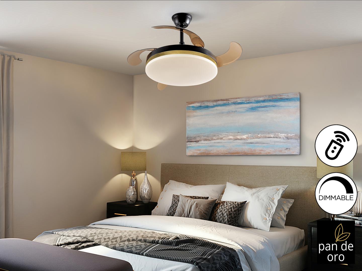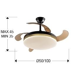 Потолочный вентилятор со светодиодной подсветкой CCT DIMMABLE из металла с матово-черным покрытием и кольцом из ЗОЛОТЫХ ЛИСТЬЕВ. Опаловый диффузор и дымовые выдвижные лопасти из акрила. Двигатель постоянного тока с 6 скоростями и реверсом. Регулируемая тональность света. Таймер. Пульт дистанционного управления в комплекте. Светодиод 36 Вт, 1830 лм, 3000-6000 К. Вентилятор: 4-х лопастной, выдвинутый Ø100 см. Радиус действия: Ø180 см (измеряется на 140 см ниже вентилятора). Двигатель постоянного тока 38 Вт. 6 скоростей (185/200/210/225/245/265 об/мин). Расход воздуха (215/400/593/741/889/949 м3/ч). Обратное движение. Шум: от 37 до 42 дБ.
