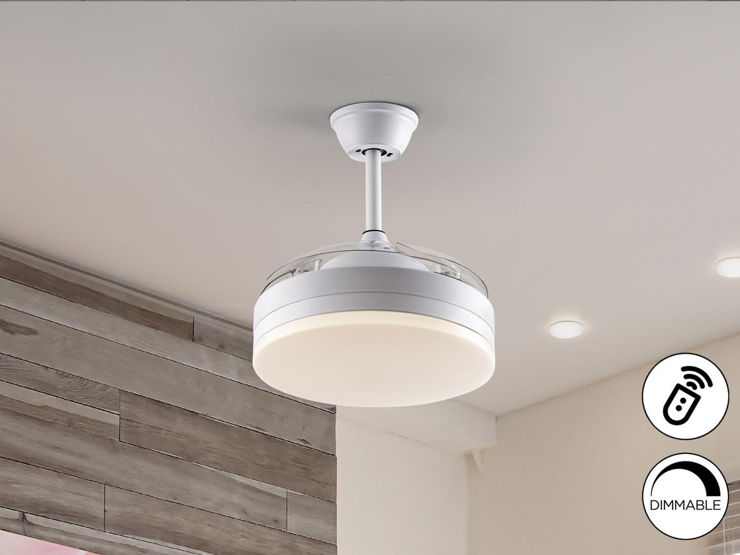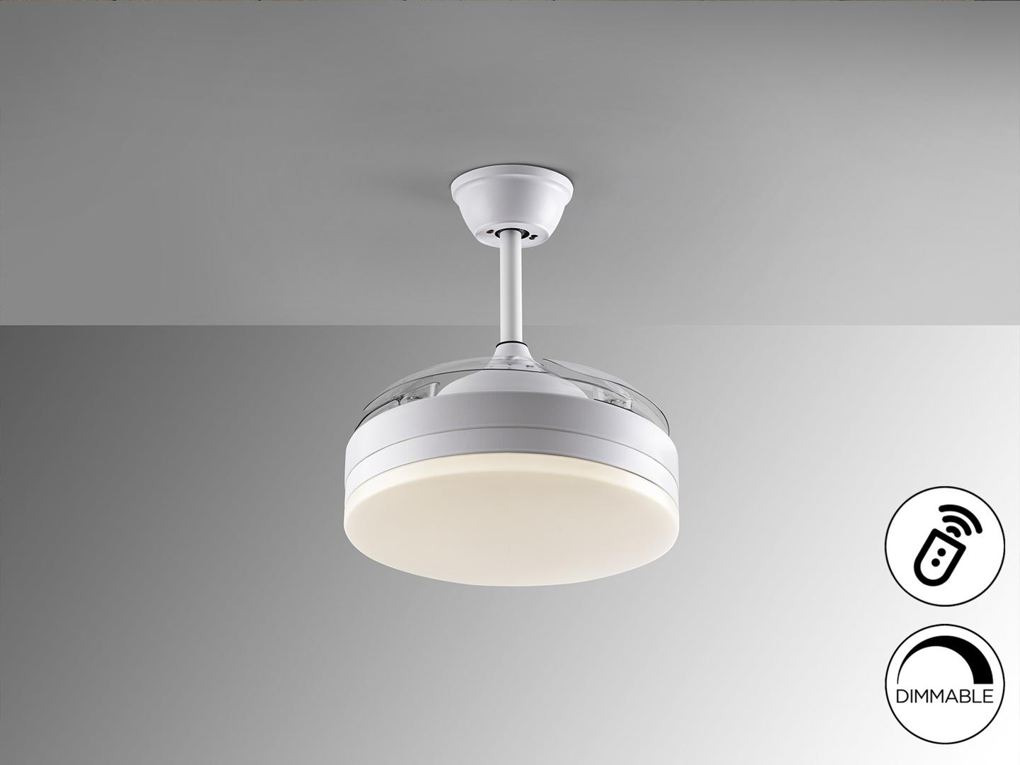 Потолочный вентилятор со светодиодной подсветкой DIMMABLE CCT из металла с матовой белой отделкой и белым кольцом. Опаловый рассеиватель и прозрачные выдвижные лопасти из акрила. Двигатель постоянного тока с 6 скоростями и реверсом. Регулируемая цветовая температура. Таймер. Функция памяти. Включает дистанционное управление. Светодиод 24Вт, 1300 лм, 3000-4000-6000 К. Вентилятор: 4-х лопастной пропеллерный двигатель постоянного тока 35Вт. 6 скоростей. обратное движение. Функция «Бриз». Слух: 37а 42Дб