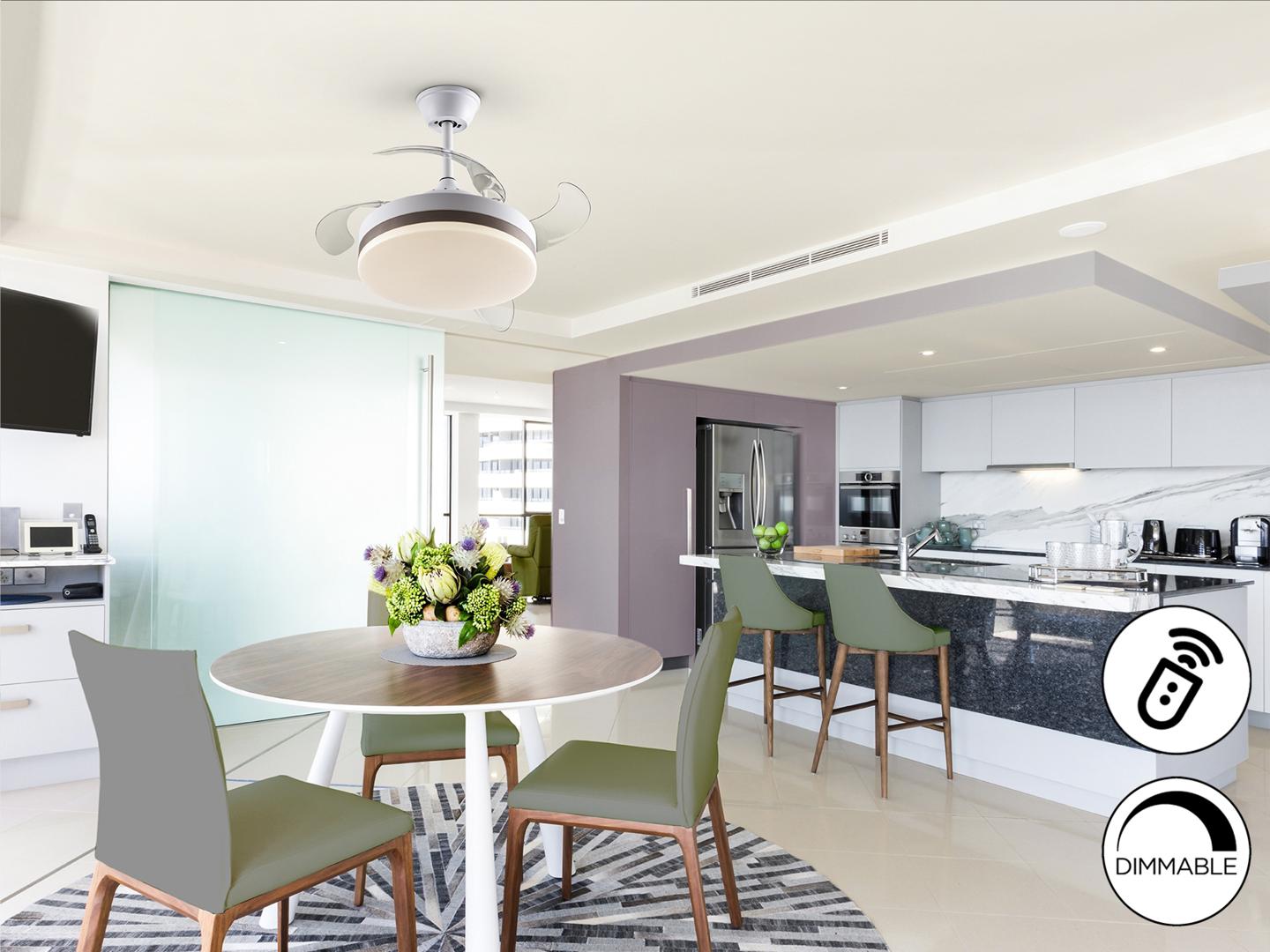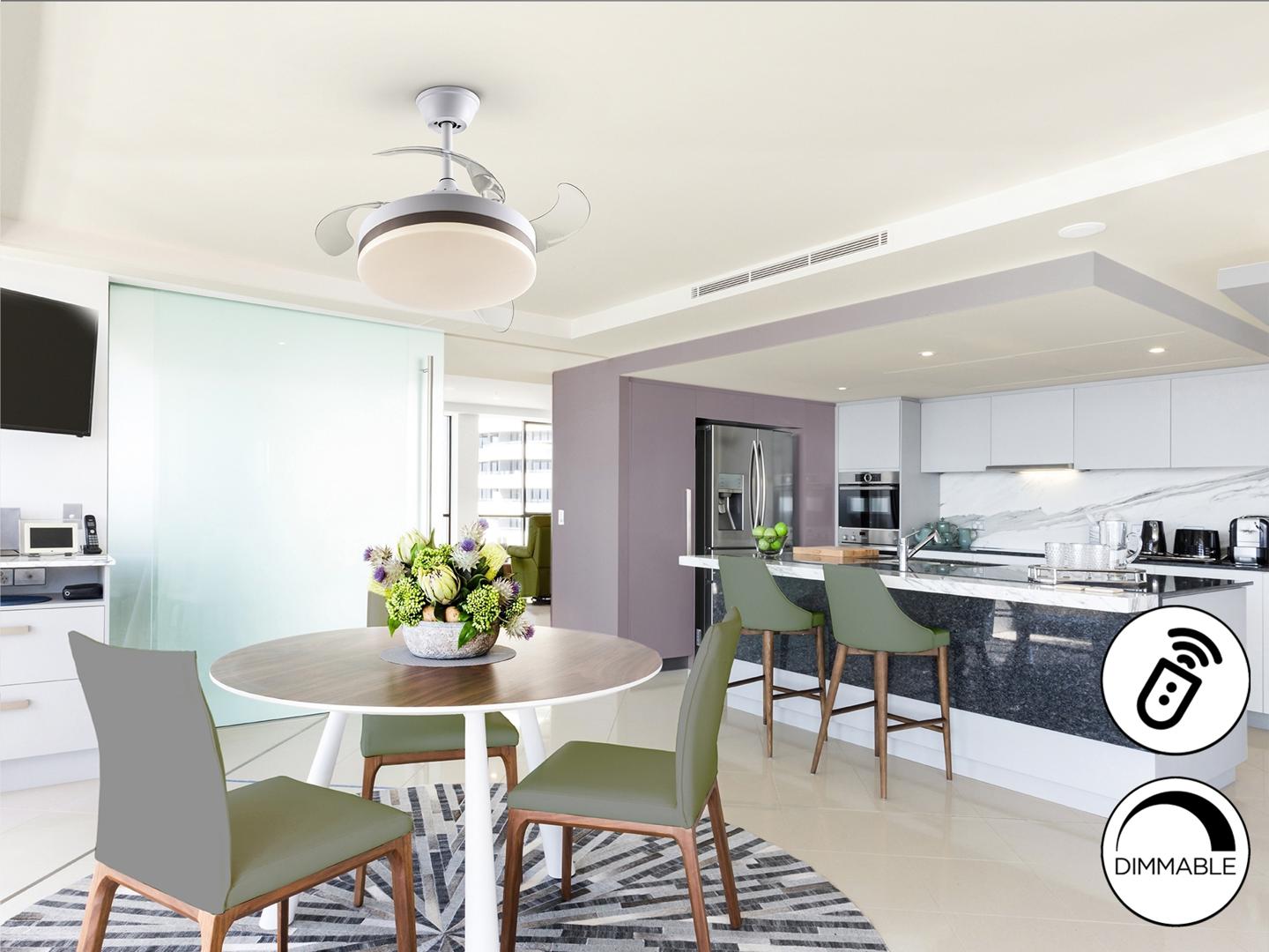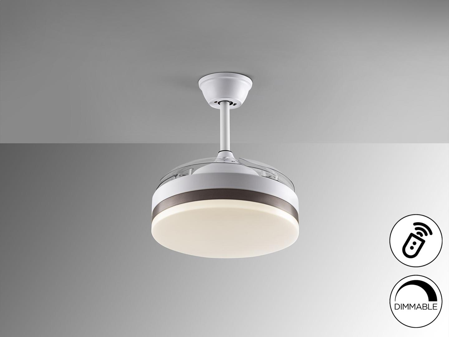 Потолочный вентилятор со светодиодной подсветкой DIMMABLE CCT из металла с матовой белой отделкой и бронзовым кольцом. Опаловый рассеиватель и прозрачные выдвижные лопасти из акрила. Двигатель постоянного тока с 6 скоростями и реверсом. Регулируемая цветовая температура. Таймер. Функция памяти. Включает дистанционное управление. Светодиод 24Вт, 1300 лм, 3000-4000-6000 К. Вентилятор: 4-х лопастной пропеллерный двигатель постоянного тока 35Вт. 6 скоростей. обратное движение. Функция «Бриз». Слух: 37а 42Дб