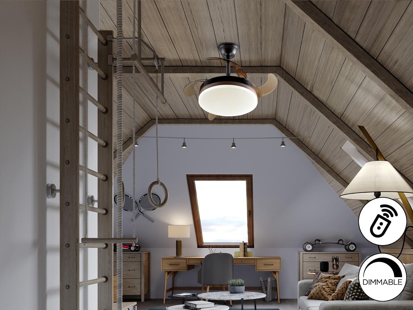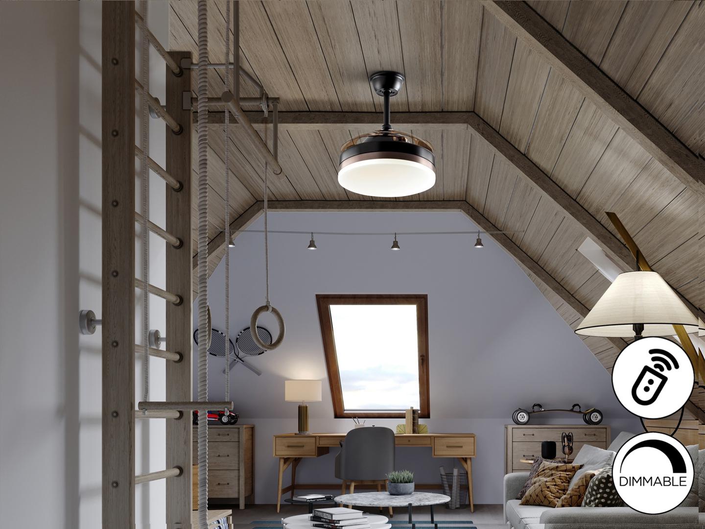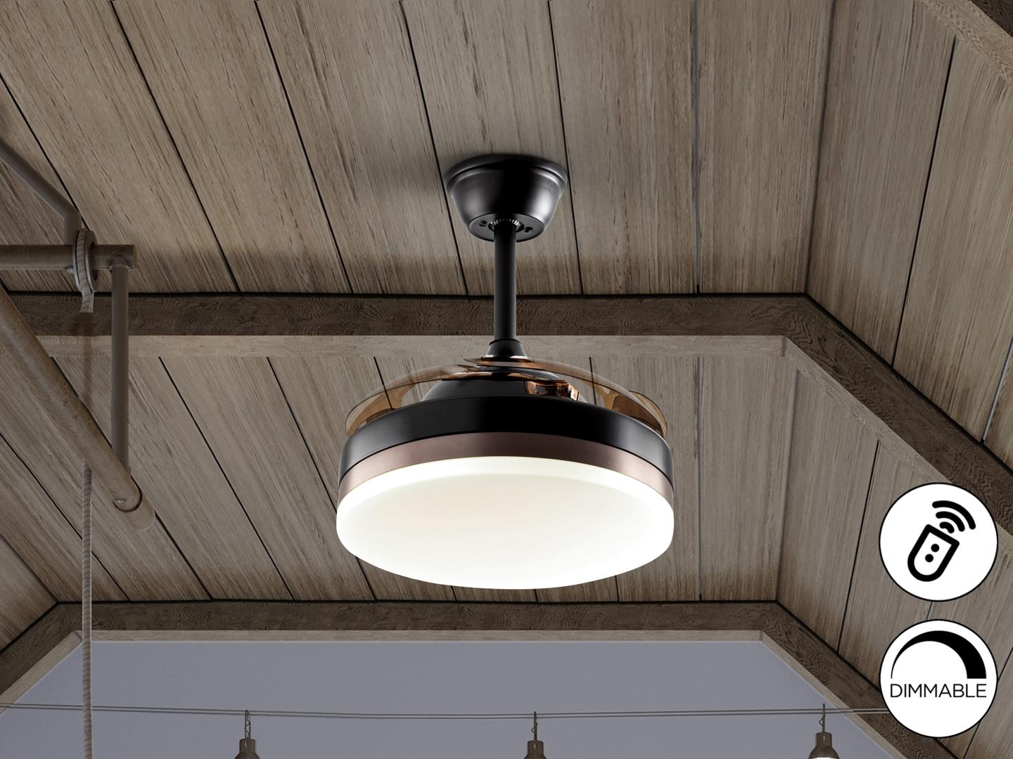 Потолочный вентилятор со светодиодной подсветкой DIMMABLE CCT из металла с матовой черной отделкой и бронзовым кольцом. Опаловый диффузор и дымовые выдвижные лопасти из акрила. Двигатель постоянного тока с 6 скоростями и реверсом. Регулируемая цветовая температура. Таймер. Функция памяти. Включает дистанционное управление. Светодиод 24Вт, 1300 лм, 3000-4000-6000 К. Вентилятор: 4-х лопастной пропеллерный двигатель постоянного тока 35Вт. 6 скоростей. обратное движение. Функция «Бриз». Слух: 37а 42Дб.