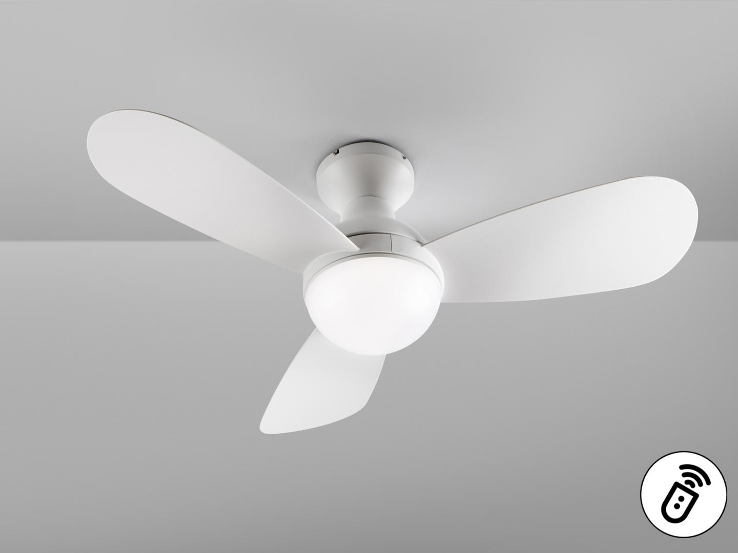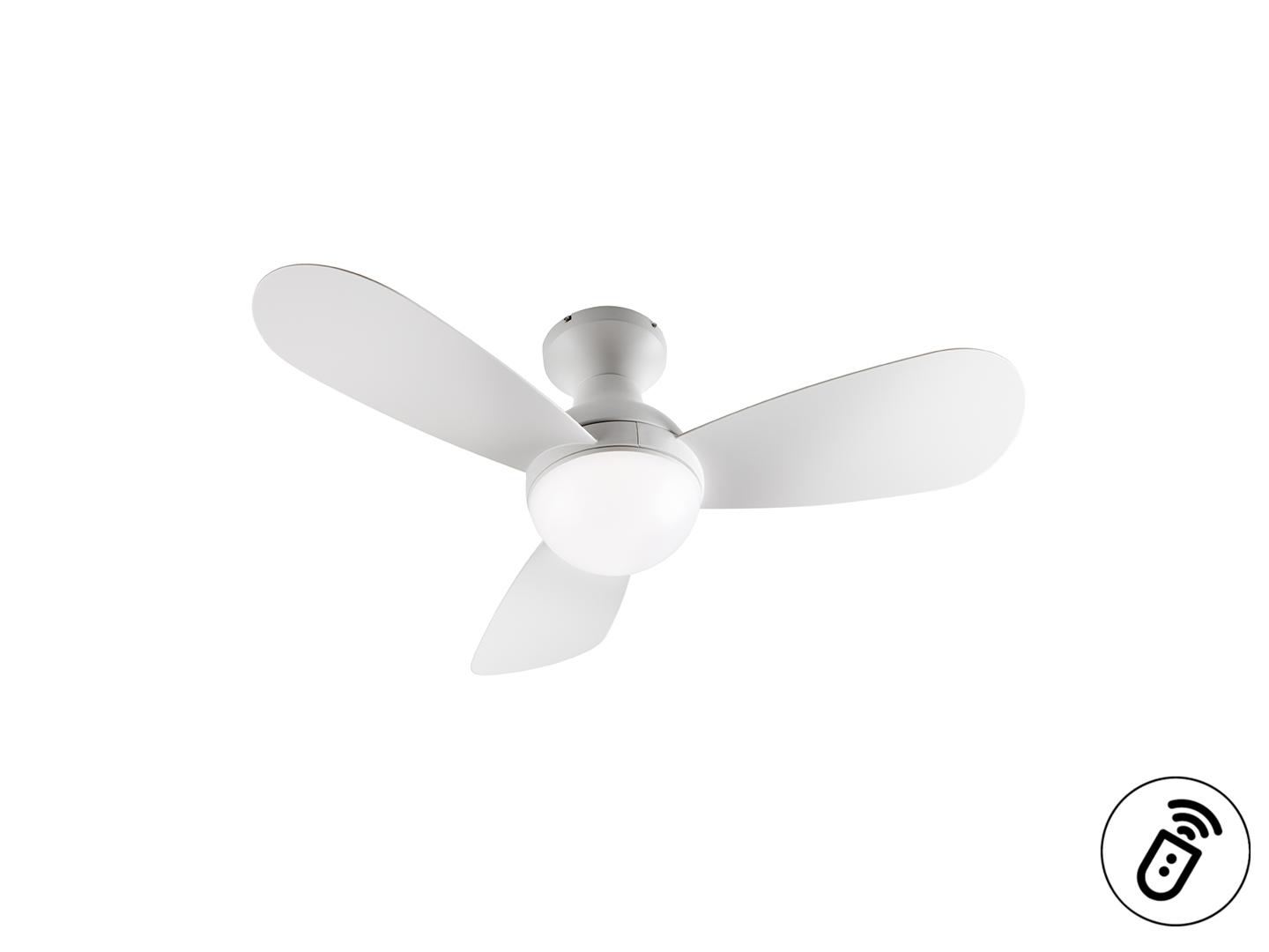 Потолочный вентилятор со светодиодной подсветкой CCT, изготовлен из металла с матовой белой отделкой и лопастями из глянцевого белого акрила. Опаловый акриловый рассеиватель. Двигатель постоянного тока 6 скоростей и реверс, 3 цветовых температуры. Таймер. Пульт дистанционного управления в комплекте. Светодиод 24 Вт, 1920 лм, 3000-6000 К. Вентилятор: 3-х лопастной пропеллер, выдвинутый Ø117 см. Радиус действия: Ø180 см (измеряется на 140 см ниже вентилятора). Двигатель постоянного тока 35 Вт. 6 скоростей. Обратное движение.