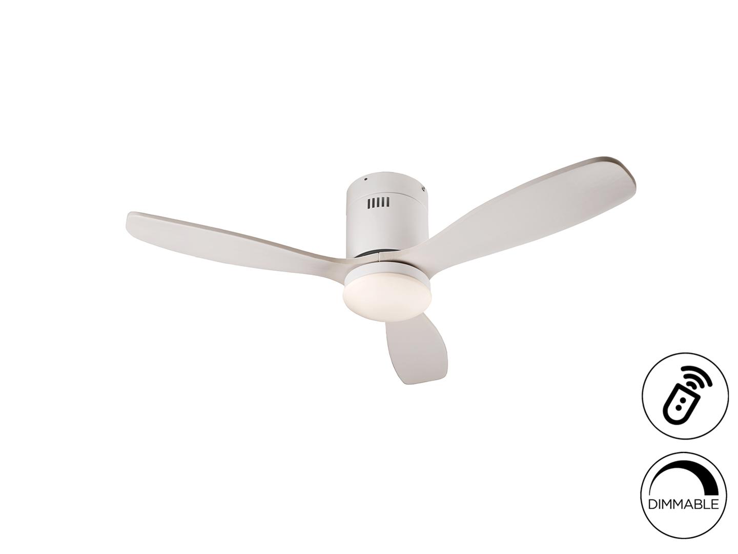 Потолочный вентилятор со светодиодной подсветкой. Изготовлен из металла и дерева с белой отделкой. ДИММИРУЕМАЯ. Рассеиватель из опалового стекла. Вентилятор с двигателем постоянного тока с реверсом. Светодиод CCT с трехцветной цветовой температурой. Таймер. Пульт дистанционного управления в комплекте. Светодиод 24 Вт, 1980 лм, 3000К/4000К/5000К. Двигатель постоянного тока мощностью 10 Вт с 6 скоростями. Вентилятор: 3-лопастной пропеллер, Ø107 см. 6-ступенчатая (103/128/151/177/204/225 об/мин). Расход воздуха (133/200/267/326/376/400 м3/ч). Движение обратное. Шум: 38-45Дб.
