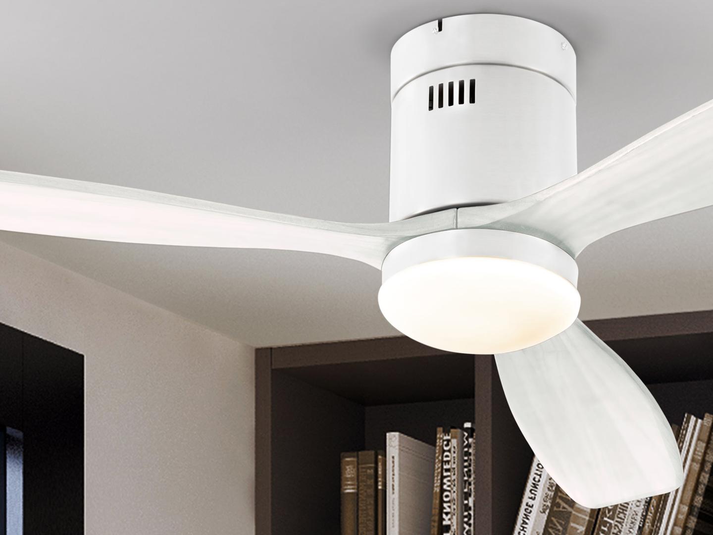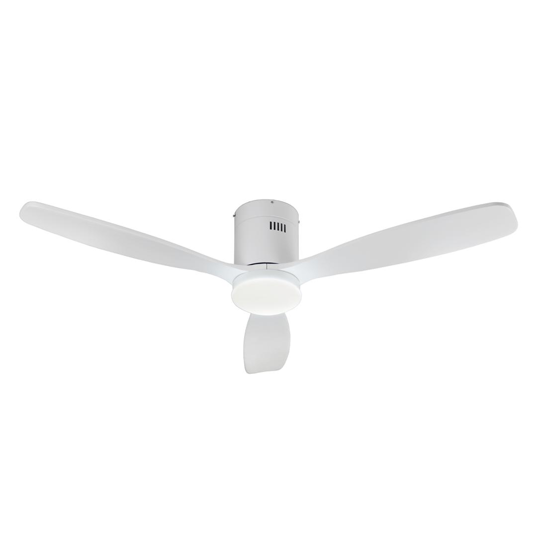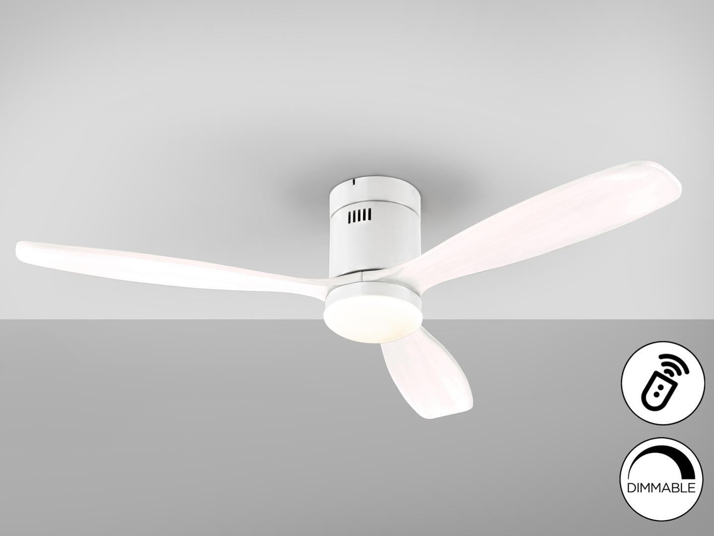 Потолочный вентилятор со светодиодной подсветкой. Диммируемый. Изготовлен из металла, лезвия из дерева, отделка белая. Рассеиватель из опалового стекла. Вентилятор с 6-скоростным реверсивным двигателем постоянного тока. Светодиод CCT трехцветной цветовой температуры. Таймер. Пульт дистанционного управления в комплекте. 24 Вт 1980 лм, светодиод, 3000К/4000К/5000К. Двигатель постоянного тока мощностью 22 Вт с 6 скоростями. Вентилятор: 3-лопастной, Ø132 см. 6 скоростей (100/120/140/160/180/200 об/мин), Расход воздуха (167/245/348/563/593/618 м3/ч). Движение реверсивное. Шум: 38-45Дб.