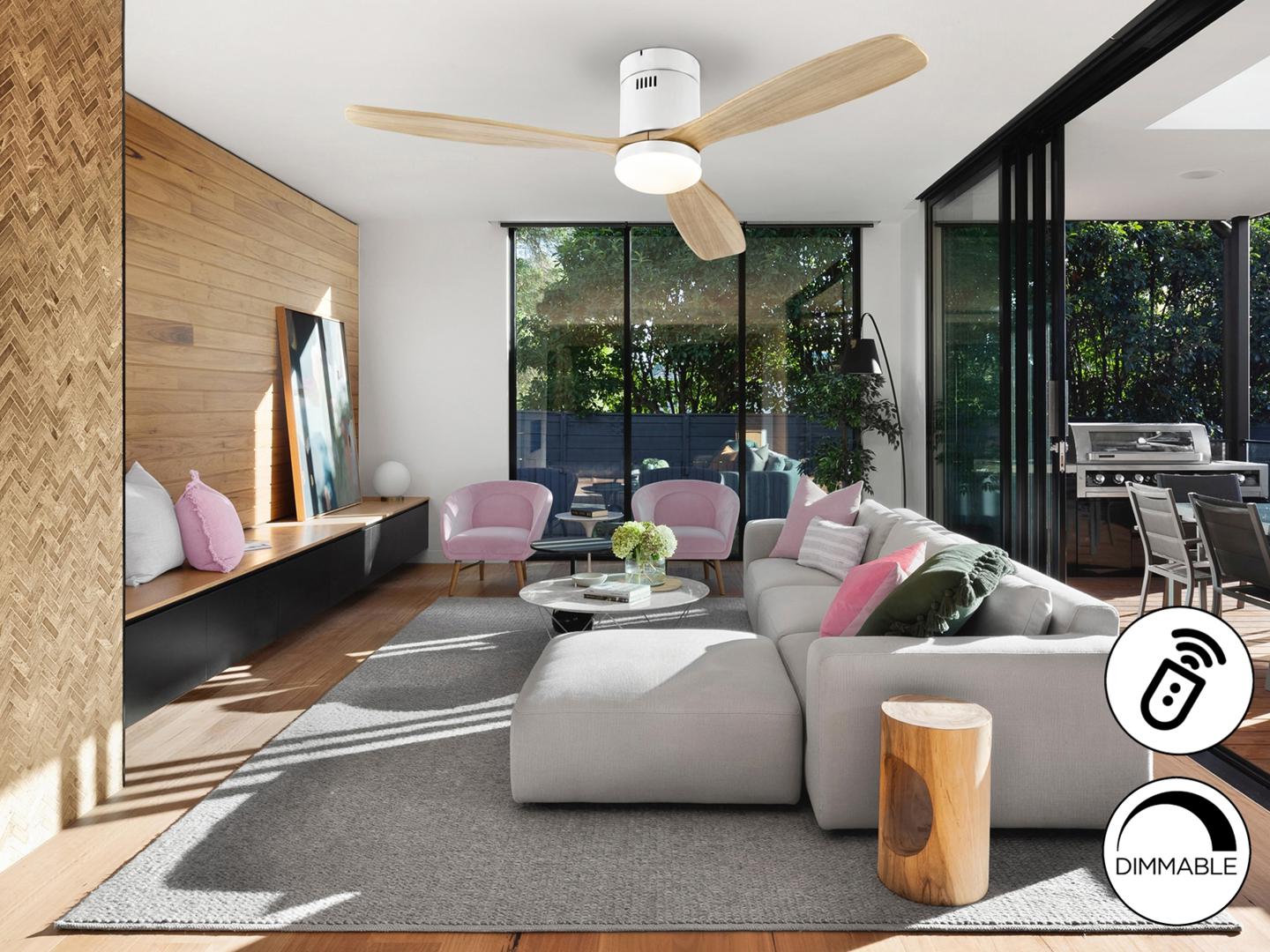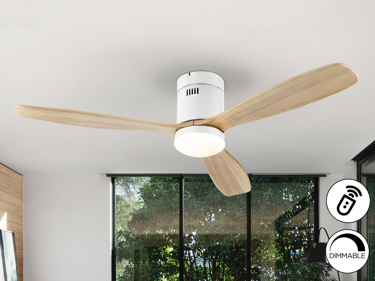 Потолочный вентилятор со светодиодной подсветкой. Диммируемый. Изготовлен из металла с матовой белой отделкой, лезвия из дерева, натуральная отделка. Рассеиватель из опалового стекла. Вентилятор с 6-скоростным реверсивным двигателем постоянного тока. Светодиод CCT трехцветной цветовой температуры. Таймер. Пульт дистанционного управления в комплекте. 24 Вт 1980 лм, светодиод, 3000К/4000К/5000К. Двигатель постоянного тока мощностью 22 Вт с 6 скоростями. Вентилятор: 3-лопастной, Ø132 см. 6 скоростей (100/120/140/160/180/200 об/мин), Расход воздуха (167/245/348/563/593/618 м3/ч). Движение реверсивное. Шум: 38-45Дб.