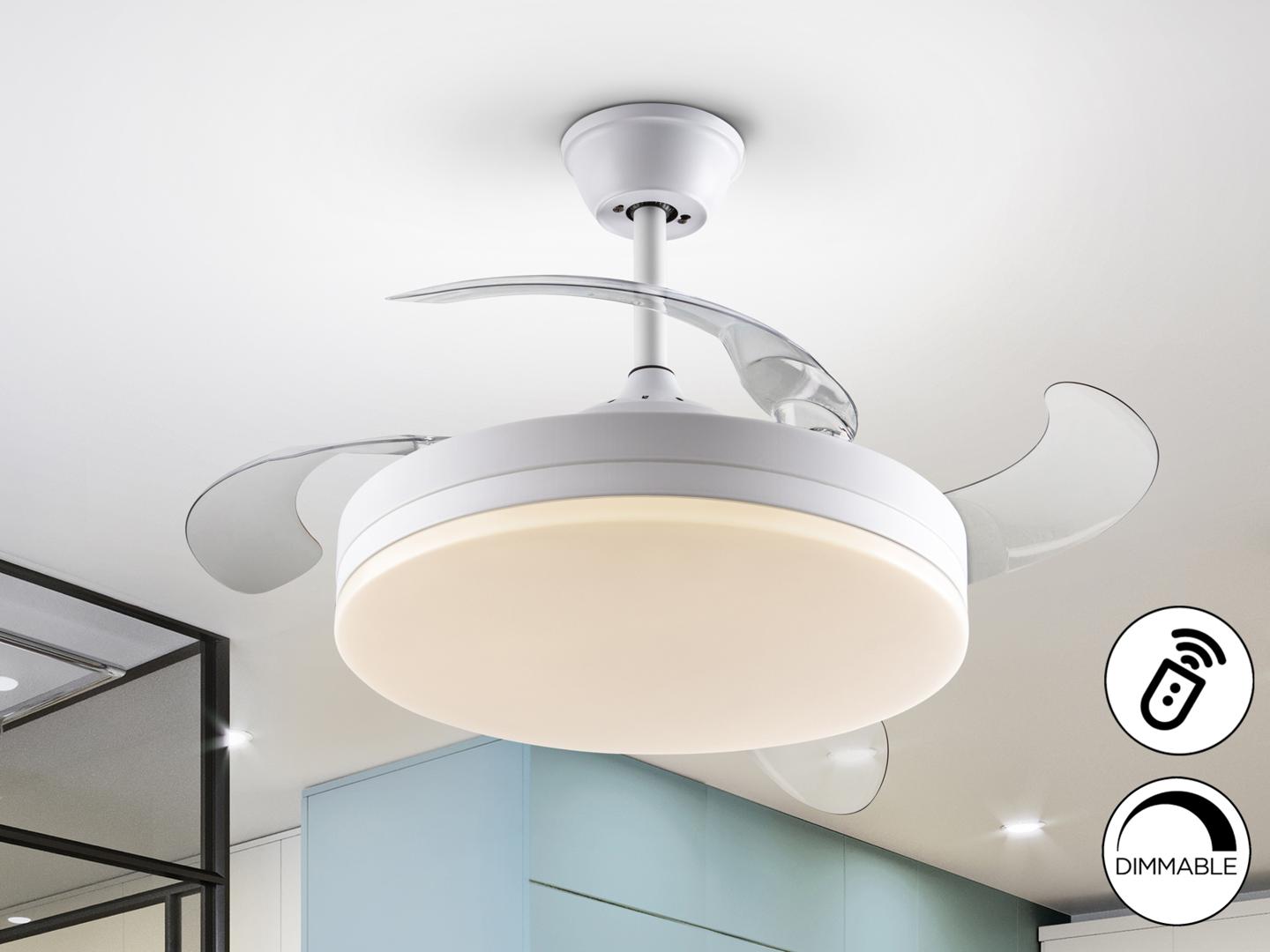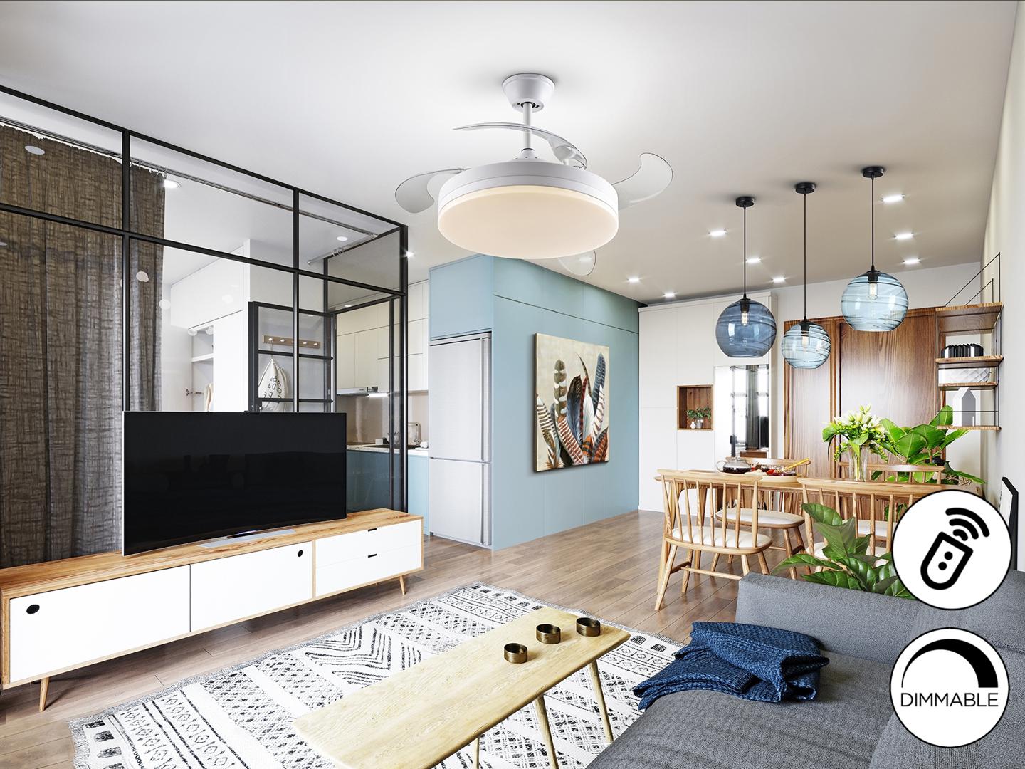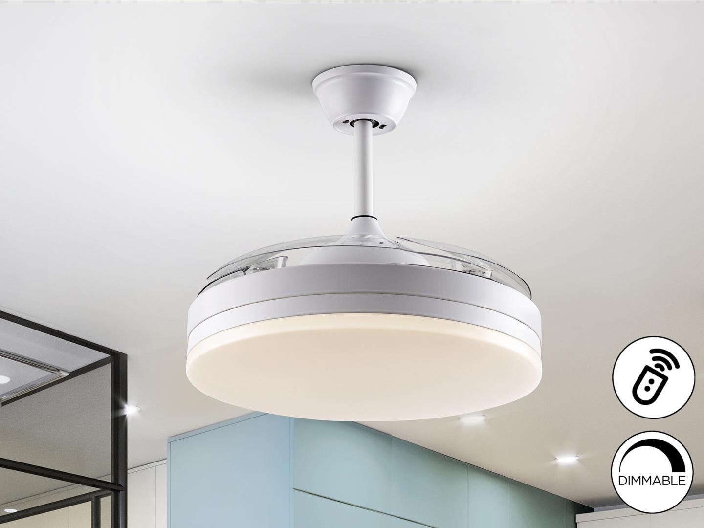 Потолочный вентилятор со светодиодной подсветкой CCT из металла с матовой белой отделкой и белым кольцом. Опаловый рассеиватель и выдвижные лопасти из дымчатого акрила. Двигатель постоянного тока с 6 скоростями и реверсом. Регулируемая цветовая температура. Временная криия В комплекте пульт дистанционного управления: светодиод 36 Вт, 1610 лм, 3000-6000К. Вентилятор: 4-лопастной пропеллер, удлиненный Ø100 см. Радиус действия: Ø180 см (измеряется на 140 см ниже вентилятора). Двигатель постоянного тока мощностью 38 Вт. 6 скоростей (185/200/210/225/245/265 об/мин). Расход воздуха (215/400/593/741/889/949 м3/ч). Обратное движение. Шум: 37 а 42Дб.