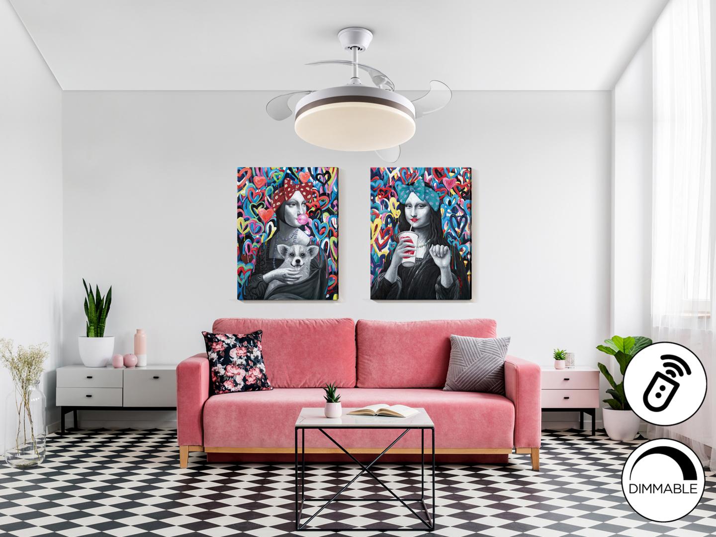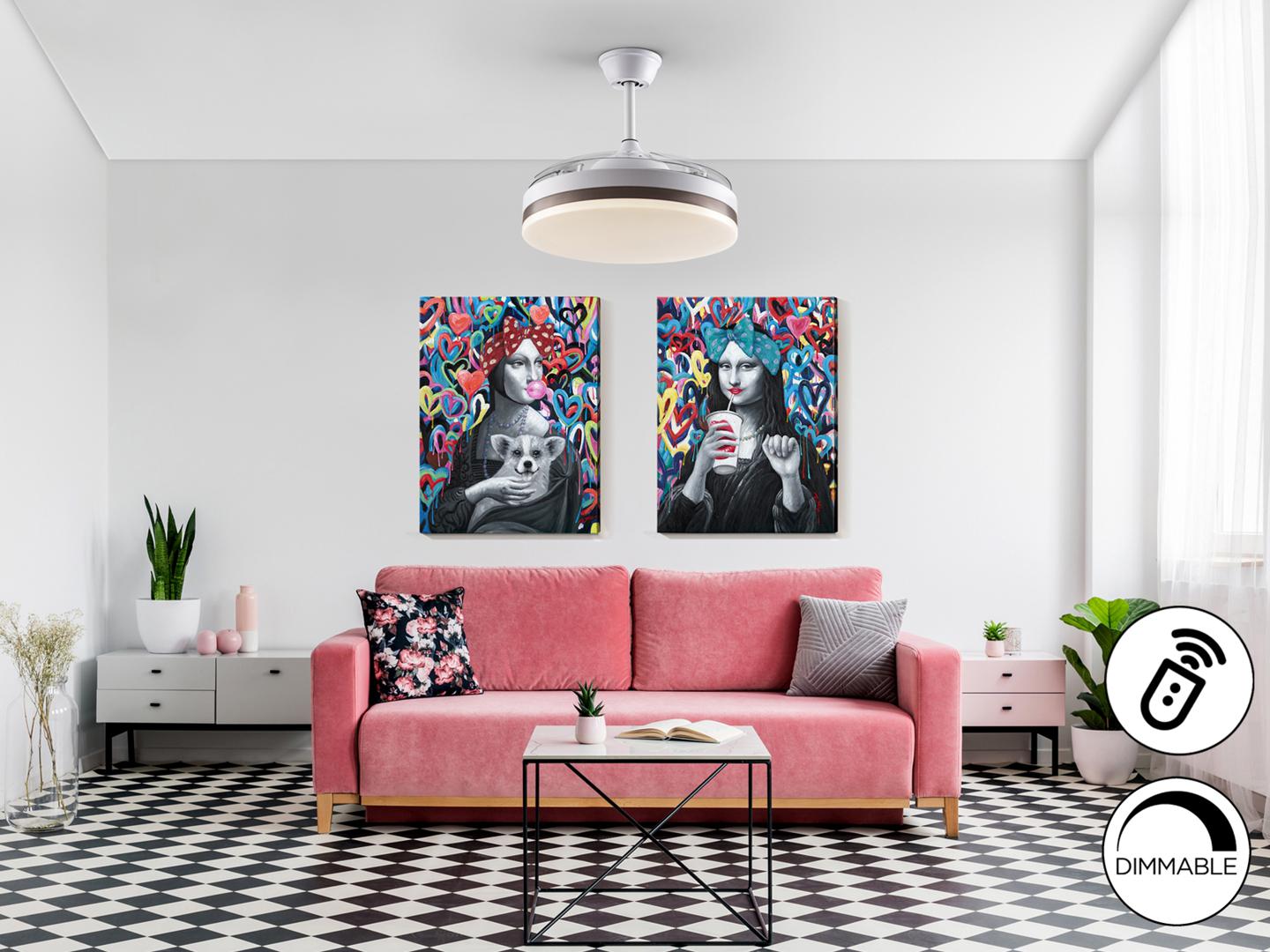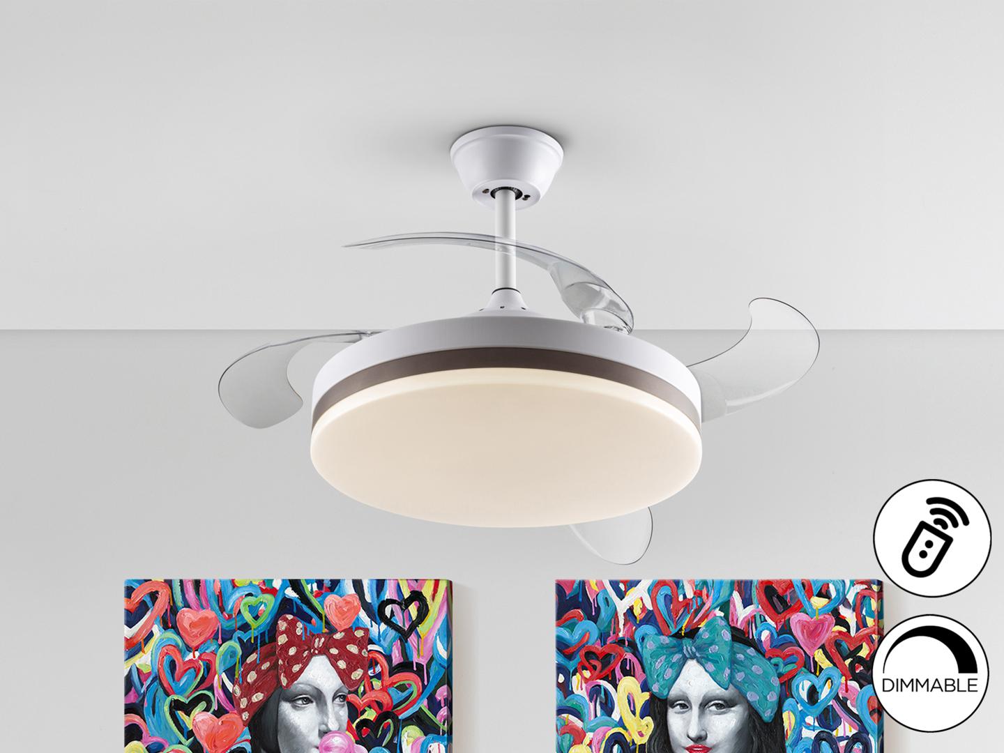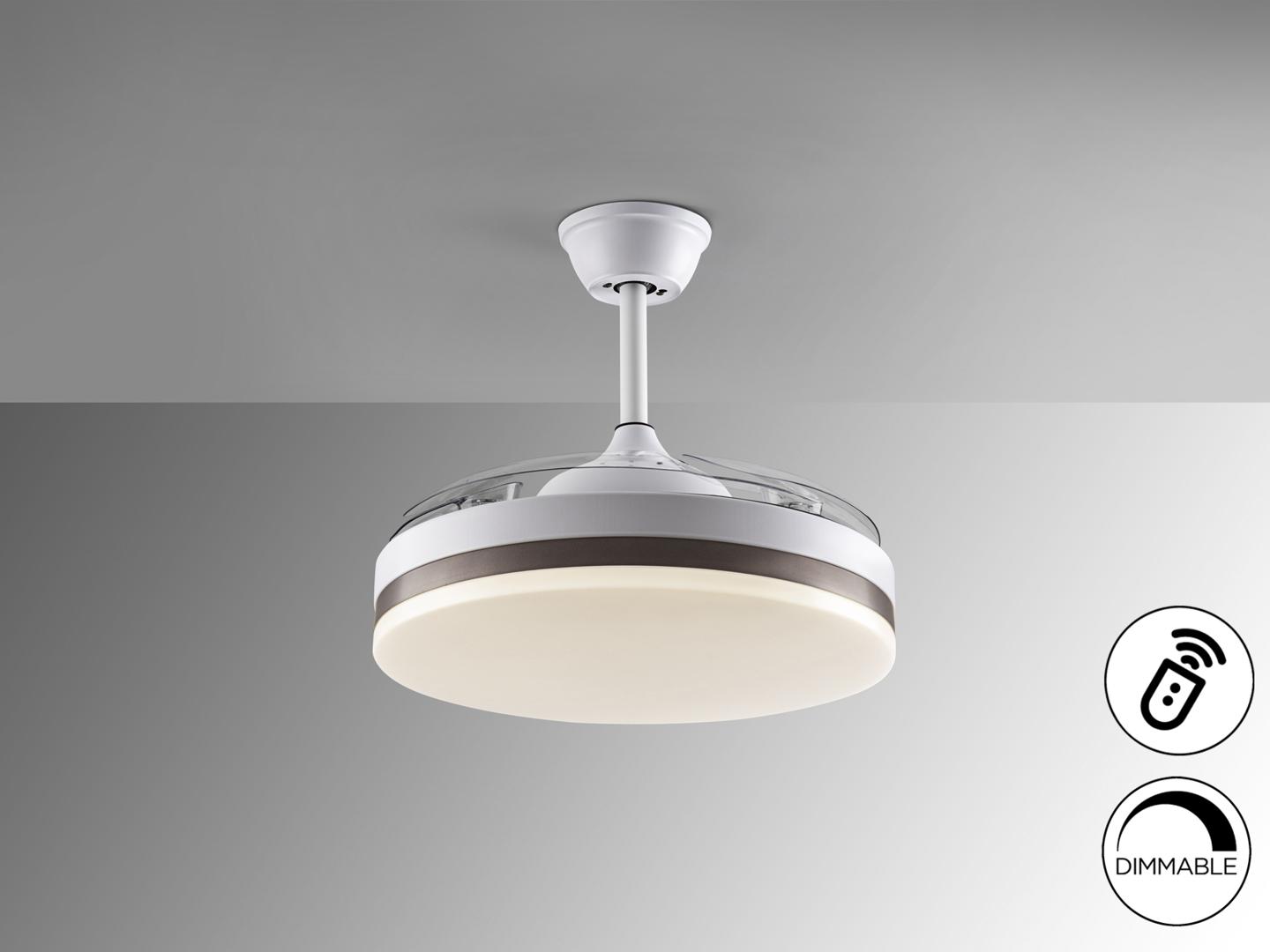 Потолочный вентилятор со светодиодной подсветкой CCT с регулируемой яркостью, изготовлен из металла с матовой белой отделкой и бронзовым кольцом. Опаловый рассеиватель и выдвижные лопасти из дымчатого акрила. Двигатель постоянного тока 6-скоростной и реверс. Регулируемая цветовая температура. Функция таймера. Система крепления против раскачивания. В комплекте пульт дистанционного управления: светодиод 36 Вт, 1610 лм, 3000-6000К. Вентилятор: 4-лопастной пропеллер, удлиненный Ø100 см. Радиус действия: Ø180 см (измеряется на 140 см ниже вентилятора). Двигатель постоянного тока мощностью 38 Вт. 6 скоростей (185/200/210/225/245/265 об/мин). Расход воздуха (215/400/593/741/889/949 м3/ч). Обратное движение. Шум: 37 а 42Дб.