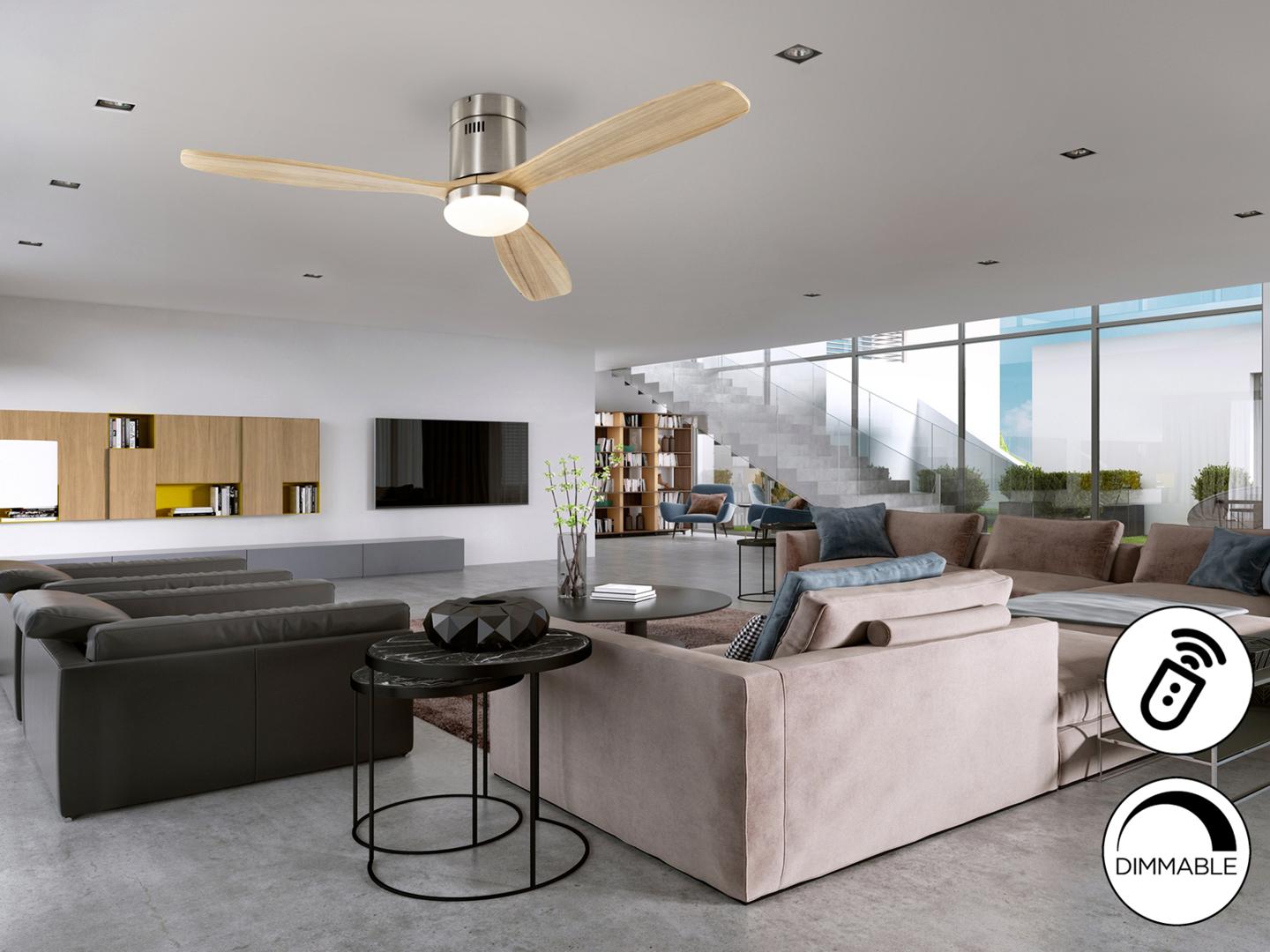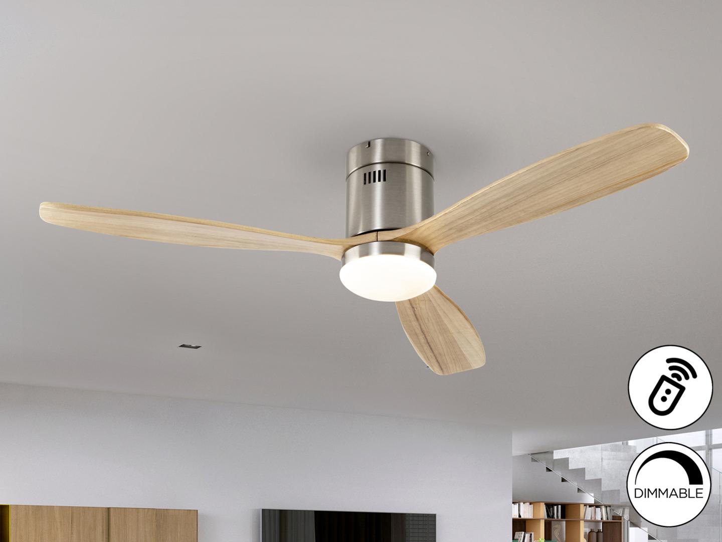 Потолочный вентилятор со светодиодной подсветкой. Диммируемый. Изготовлен из металла с матовым никелевым покрытием, лезвия из дерева, натуральная отделка. Рассеиватель из опалового стекла. Вентилятор с 6-скоростным реверсивным двигателем постоянного тока. Светодиод CCT трехцветной цветовой температуры. Таймер. Пульт дистанционного управления в комплекте. 24 Вт 1980 лм, светодиод, 3000К/4000К/5000К. Двигатель постоянного тока мощностью 22 Вт с 6 скоростями. Вентилятор: 3-лопастной, Ø132 см. 6 скоростей (100/120/140/160/180/200 об/мин), Расход воздуха (167/245/348/563/593/618 м3/ч). Движение реверсивное. Шум: 38-45Дб.