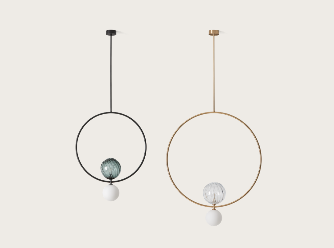Подвесной светильник, выполненный из металла и стекла в матовой черной или состаренной золотой отделке. 2 стеклянных плафона из прозрачного или опалового стекла.