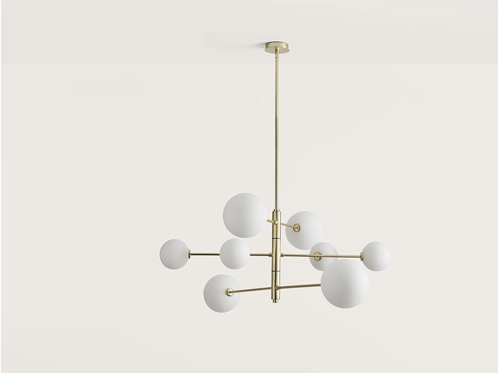 Подвесной светильник из матовой латуни или черной стали с абажурами из непрозрачных или прозрачных стеклянных шариков. Светильники можно перемещать парами, чтобы вы могли решить, какое положение вам больше нравится. В комплект входят восемь светодиодных ламп G9 мощностью 5Вт 2700К.