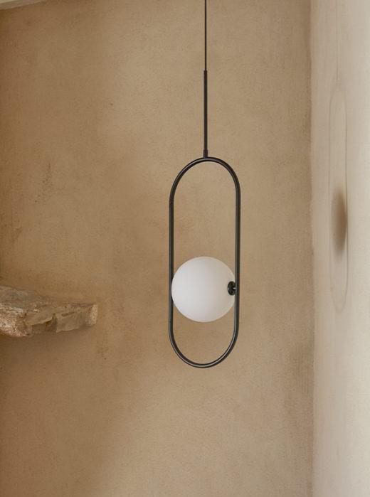 Дизайнерский подвесной светильник со стальной конструкцией в золотой или матовой черной отделке и абажуром в форме шара из матового или прозрачного дутого стекла.