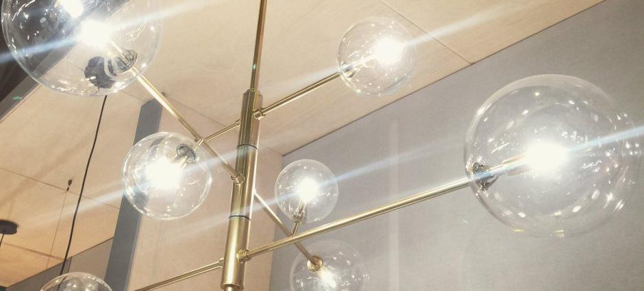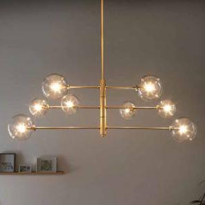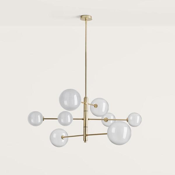 Подвесной светильник из матовой латуни или черной стали с абажурами из непрозрачных или прозрачных стеклянных шариков. Светильники можно перемещать парами, чтобы вы могли решить, какое положение вам больше нравится. В комплект входят восемь светодиодных ламп G9 мощностью 5Вт 2700К.
