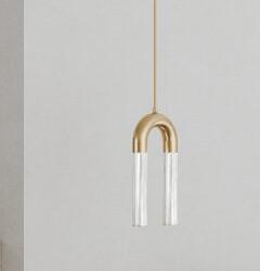 Подвесной светильник, выполненный из металла и текстурированного стекла.