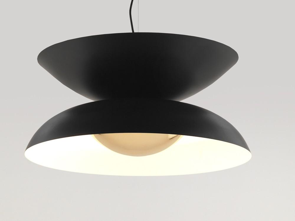 Подвесной светильник оригинального дизайна с двумя куполами из матового черного металла с внутренним абажуром белого цвета с внутренним диффузором золотистого, хромированного, черного и белого цвета. Регулируется по высоте. С тремя включенными лампочками G9 3Вт 3000к- 270лм.