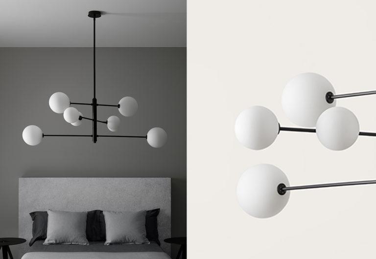 Подвесной светильник из матовой латуни или черной стали с абажурами из непрозрачных или прозрачных стеклянных шариков. Светильники можно перемещать парами, чтобы вы могли решить, какое положение вам больше нравится. В комплект входят восемь светодиодных ламп G9 мощностью 5Вт 2700К.