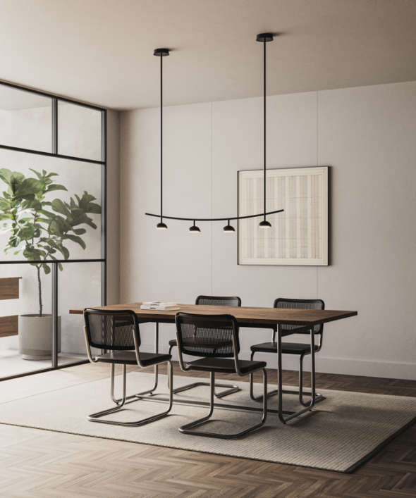 Подвесной светильник, выполненный из металла в матовой черной отделке.