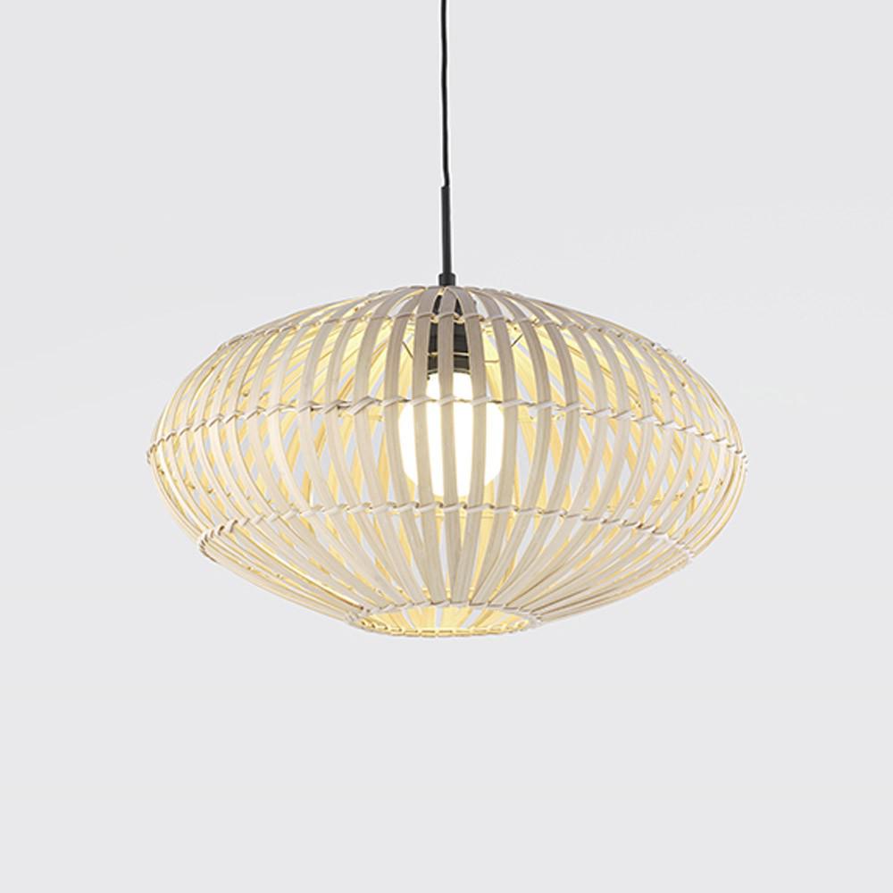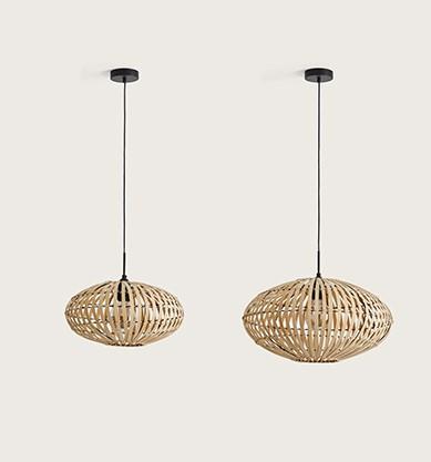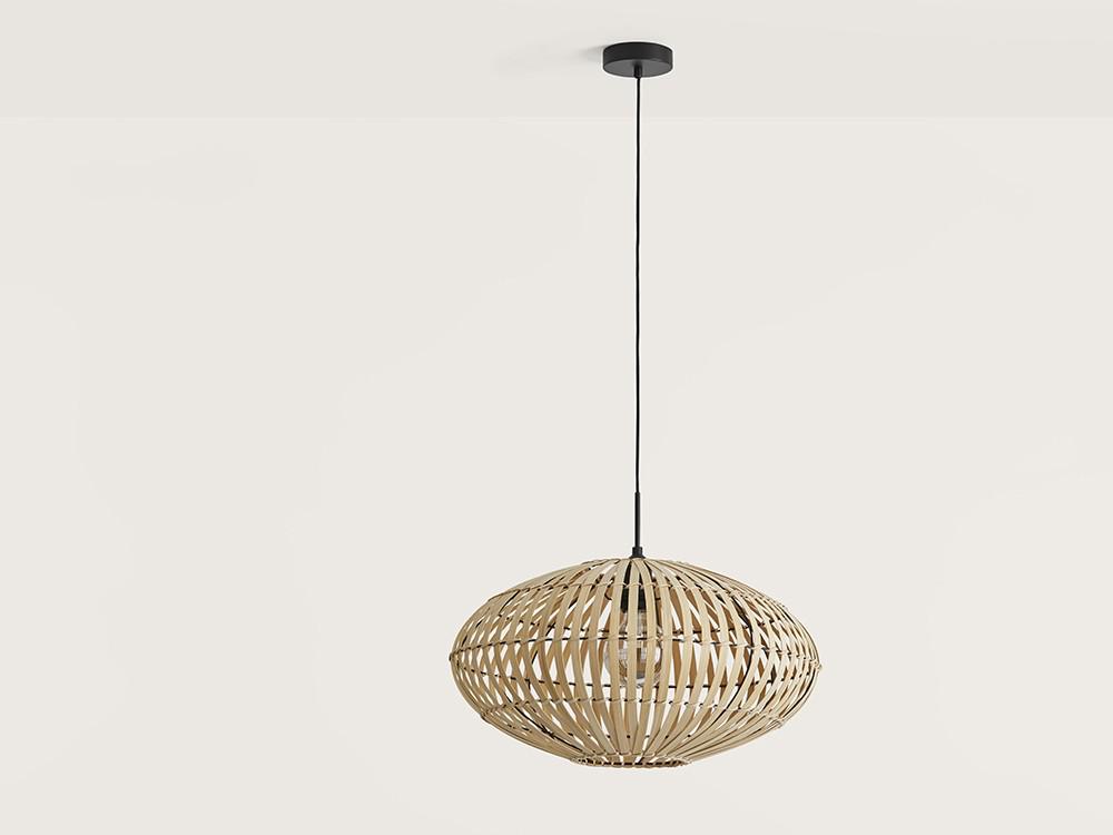 Подвесной светильник с абажуром из натурального бамбука. Матовая черная структура в сочетании с абажуром из натурального бамбука доступна в двух размерах. Металлический каркас латунный или черный.