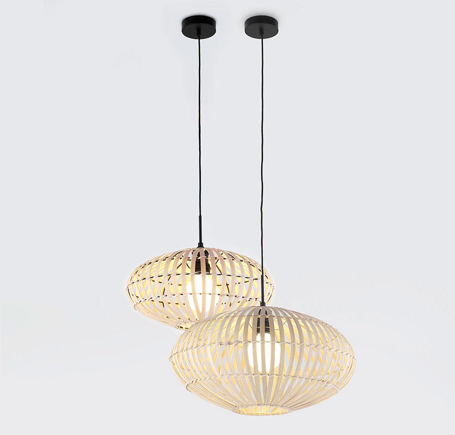 Потолочный светильник с абажуром из натурального бамбука. Матовая черная структура в сочетании с абажуром из натурального бамбука доступна в двух размерах. Металлический каркас латунный или черный.