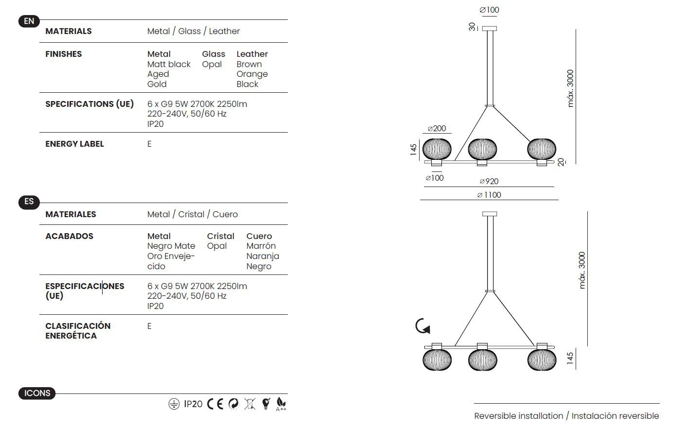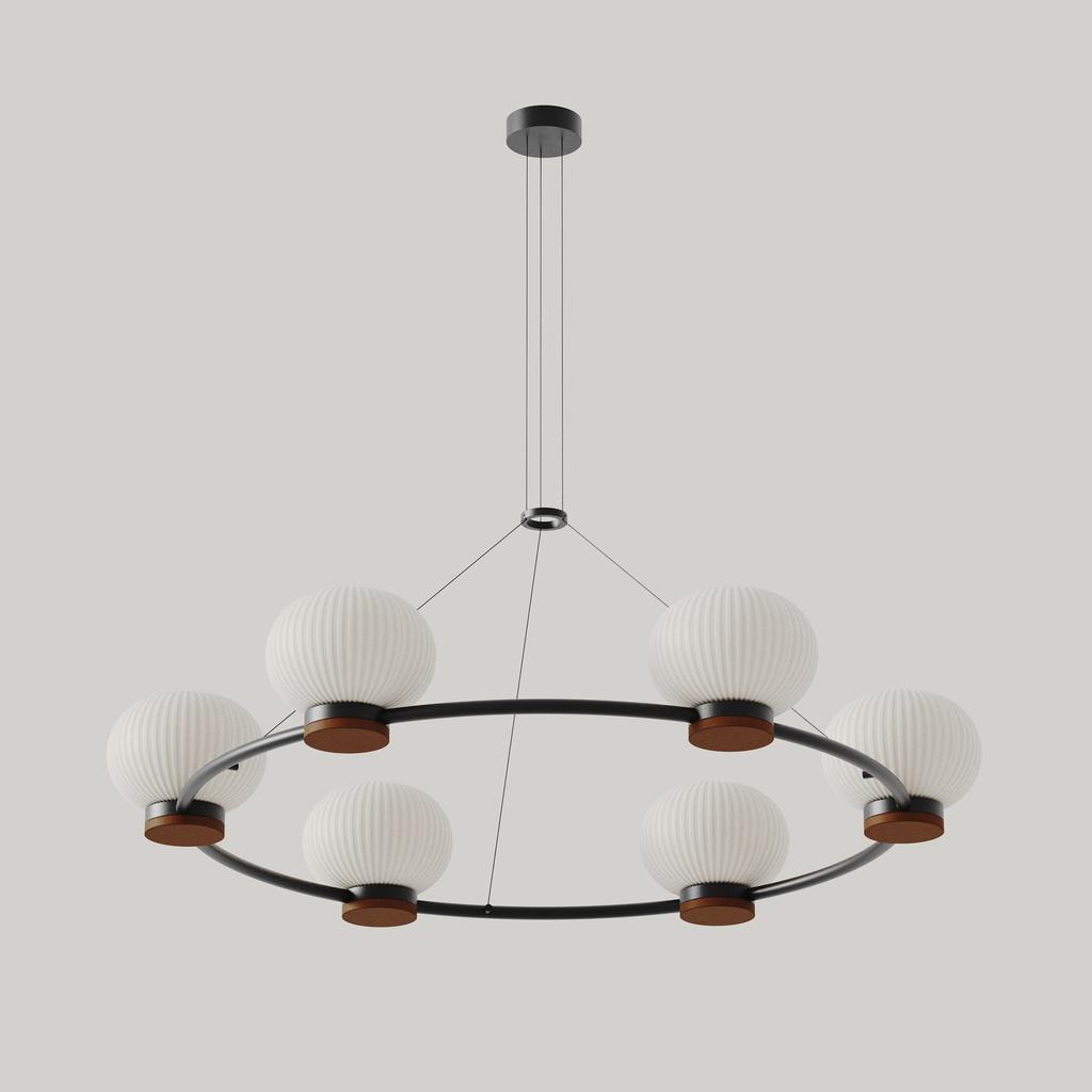 Подвесной светильник IRZO, 6 ламп G9, 5 Вт, 2700K. Металлическая отделка. Абажур из опалового стекла. Кожаная отделка (опционально). Минимальная высота 1 метр.