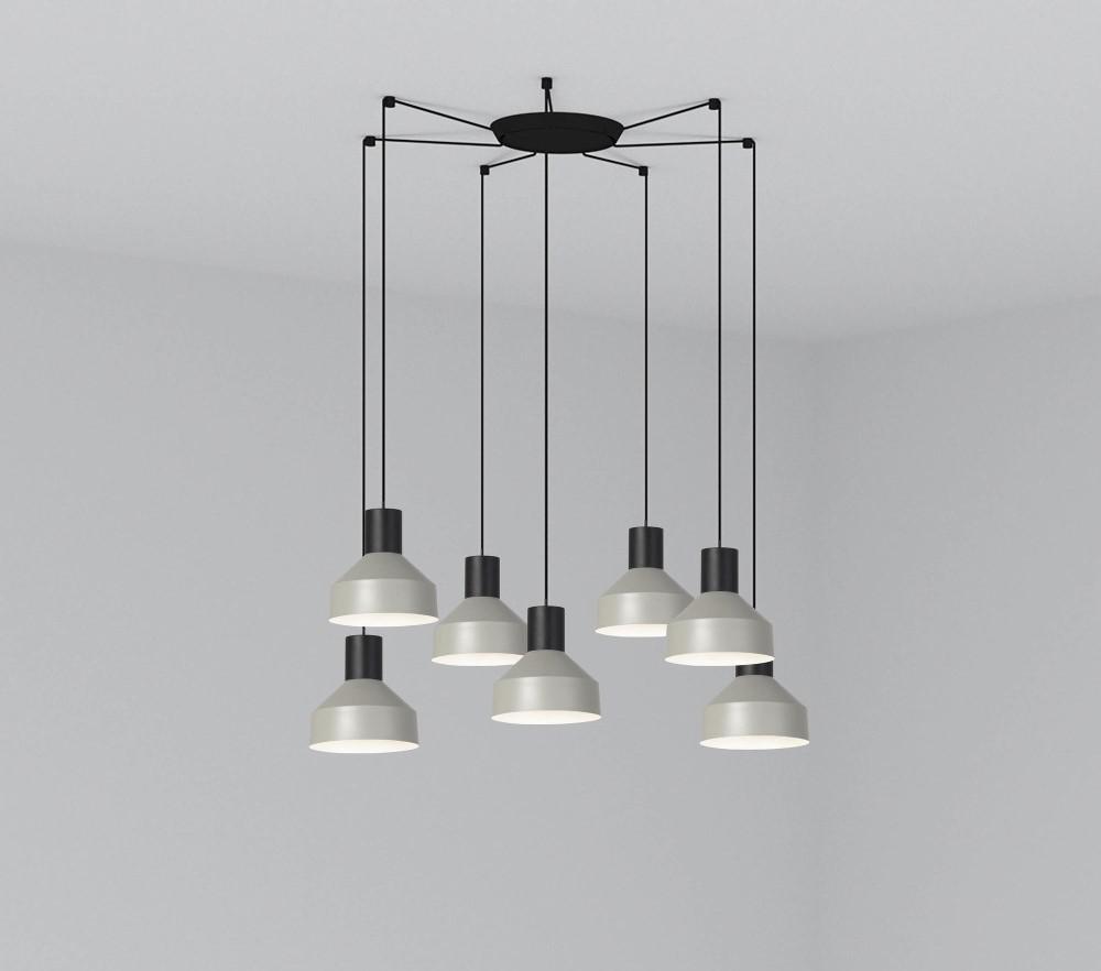 KOMBO — это семейство подвесных светильников, созданное Nutcreatives. Серия имеет разные размеры и отделку, которые имеют черную цилиндрическую структуру в верхней части. Абажур этого серого света выполнен из металла, выполнен в стиле минимализма и играет с геометрическими формами. Версия с многократным 7-световым фонарем. Его диаметр составляет 20 см.
