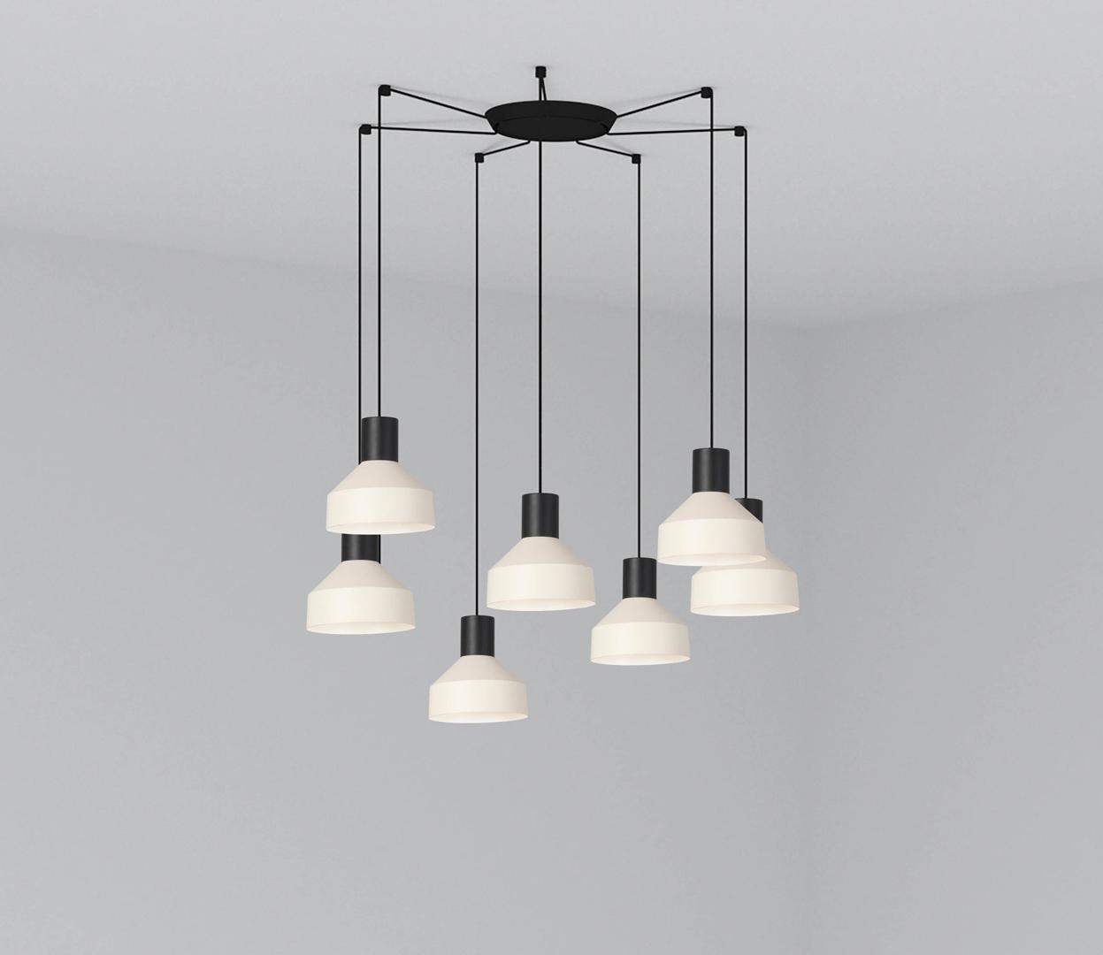 KOMBO — это семейство подвесных светильников, созданное Nutcreatives. Серия имеет разные размеры и отделку, которые имеют черную цилиндрическую структуру в верхней части. Абажур этого бежевого светильника выполнен из металла, выполнен в стиле минимализма и играет с геометрическими формами. Версия с многократным 7-световым фонарем. Его диаметр составляет 20 см.