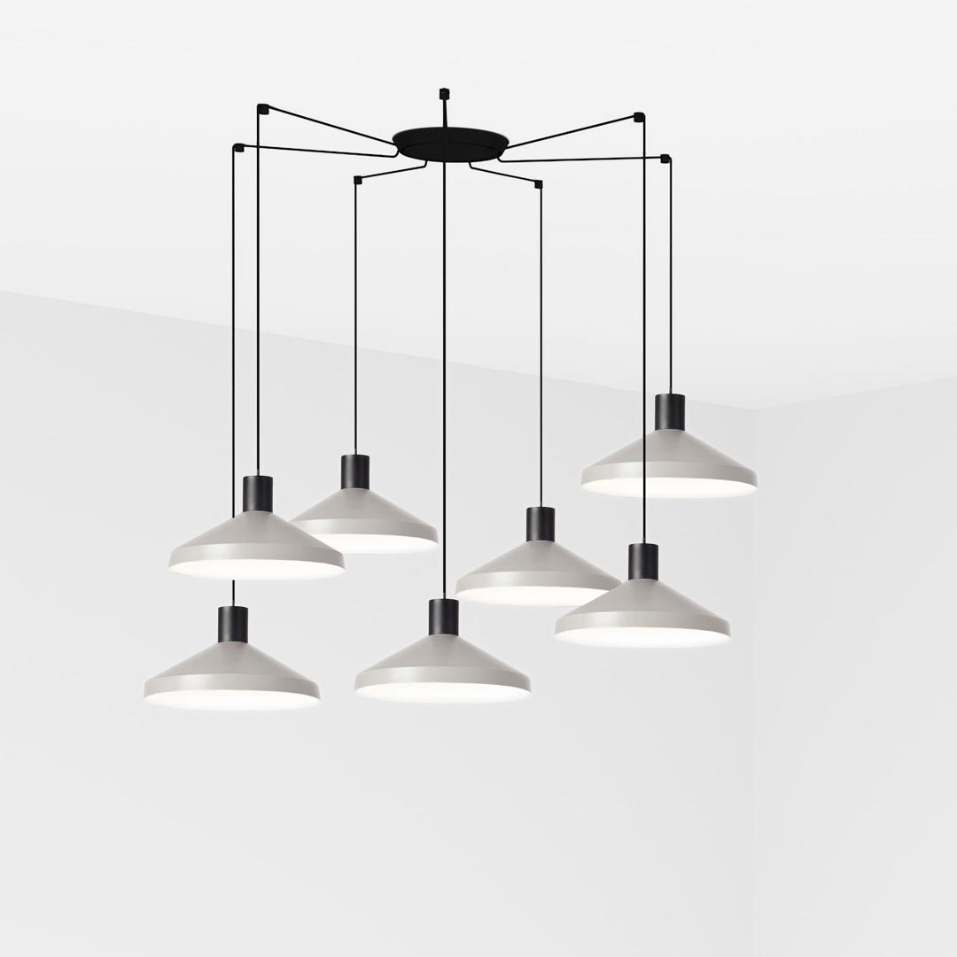 KOMBO — это семейство подвесных светильников, созданное Nutcreatives. Серия имеет разные размеры и отделку, которые имеют черную цилиндрическую структуру в верхней части. Абажур этого серого света выполнен из металла, выполнен в стиле минимализма и играет с геометрическими формами. Версия с 7 лампами. Его диаметр составляет 40 см.