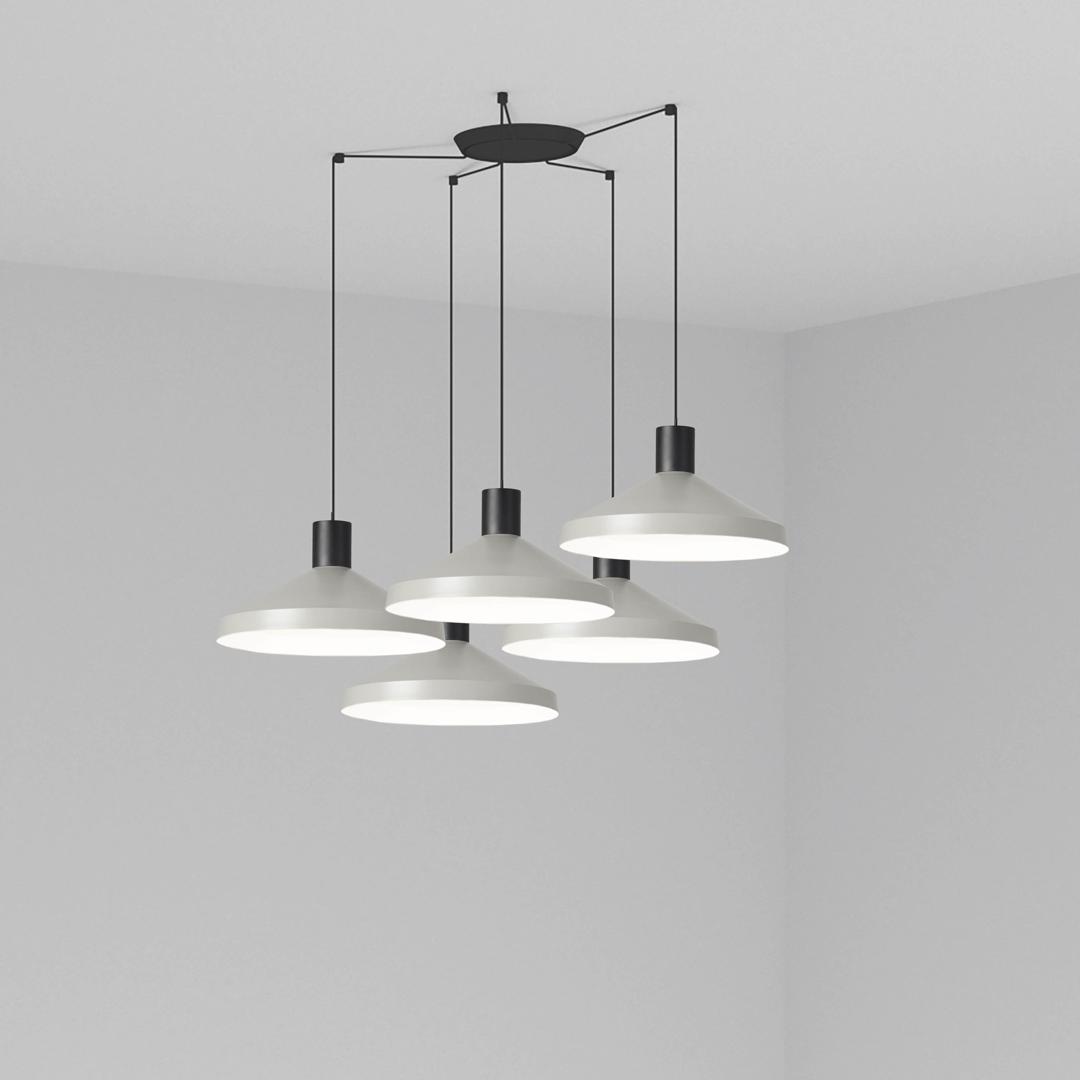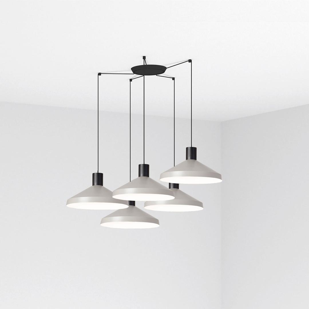 KOMBO — это семейство подвесных светильников, созданное Nutcreatives. Серия имеет разные размеры и отделку, которые имеют черную цилиндрическую структуру в верхней части. Абажур этого серого света выполнен из металла, выполнен в стиле минимализма и играет с геометрическими формами. Версия с 5 лампами. Его диаметр составляет 40 см.