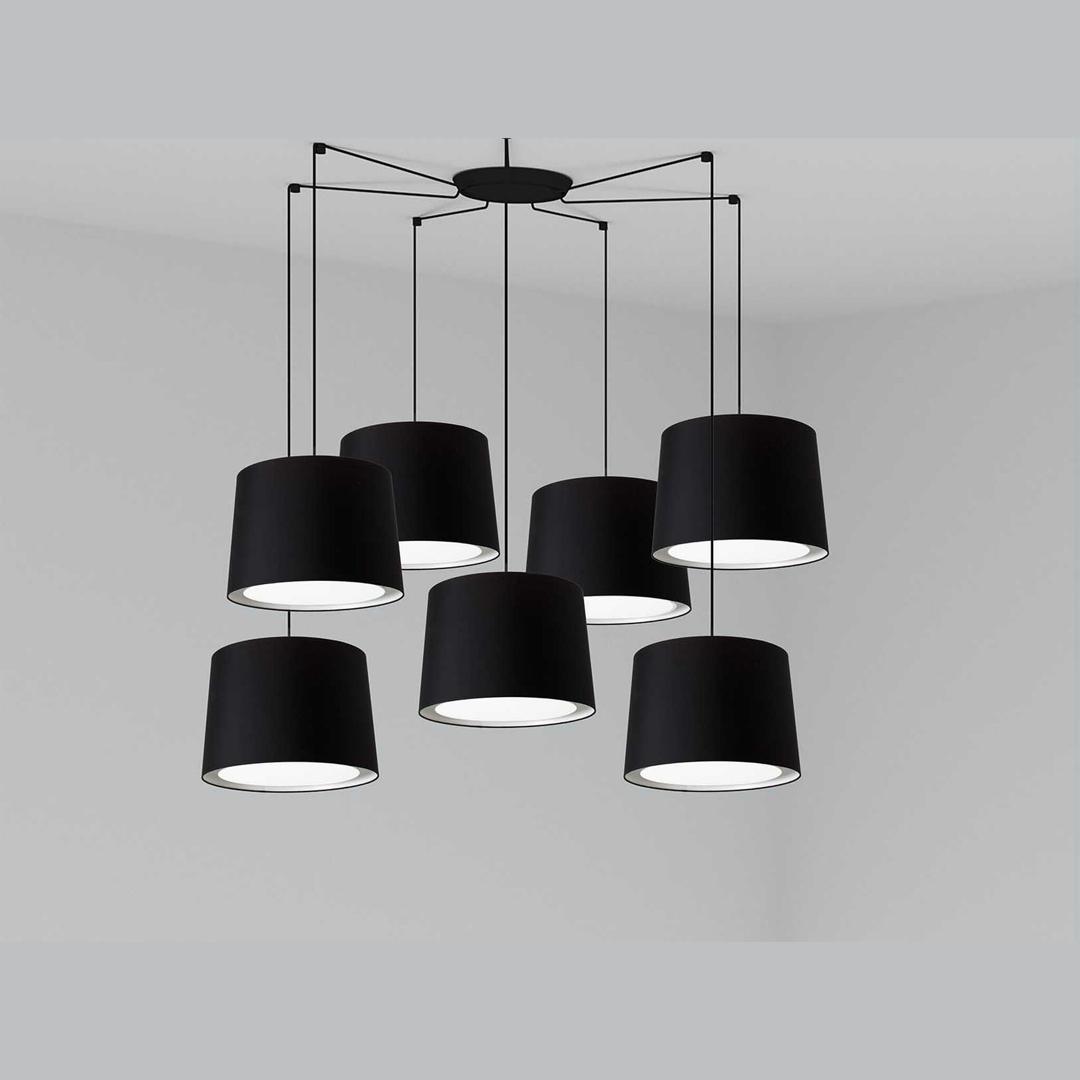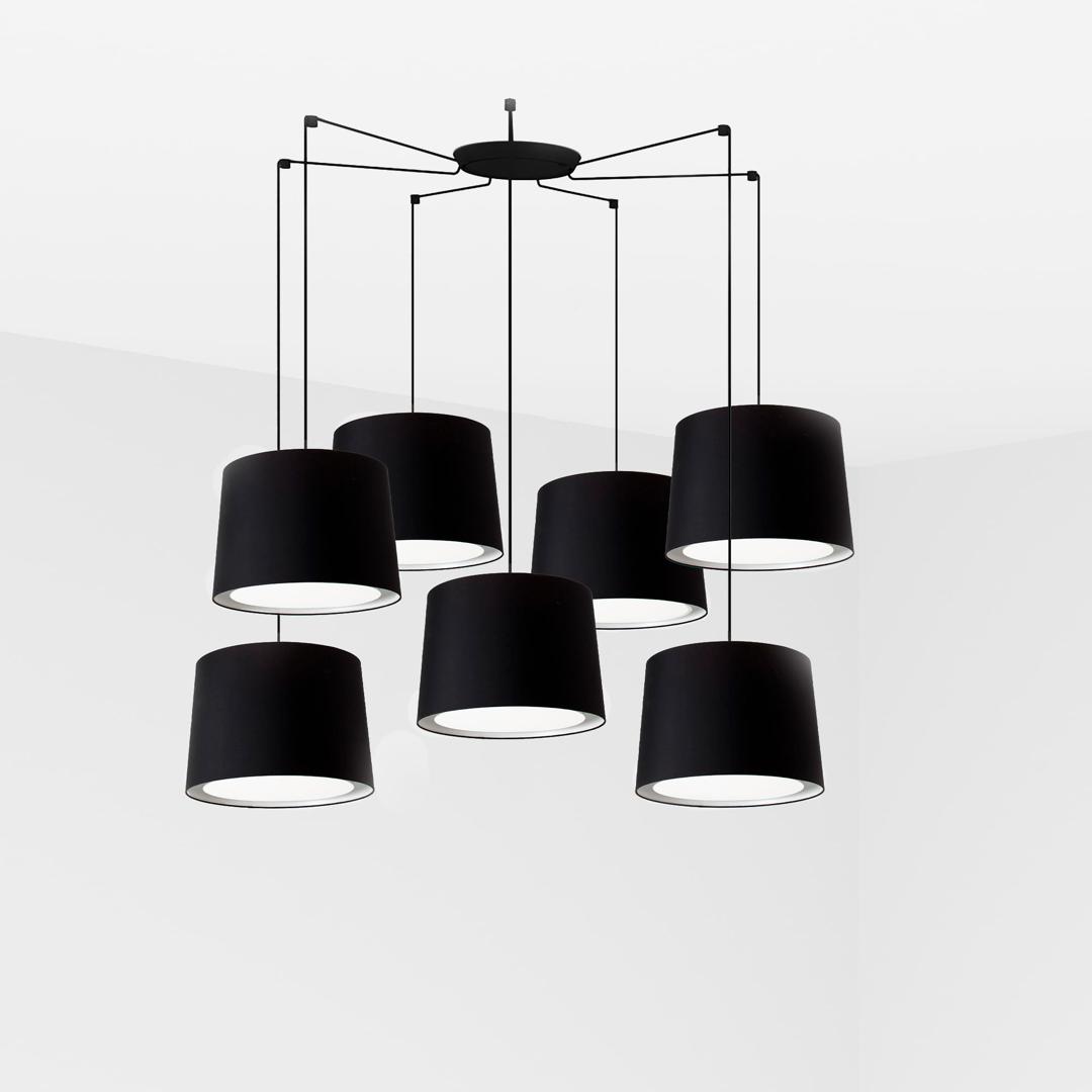 Версия с 7 лампами. CONGA — это коллекция ламп для внутреннего освещения, разработанная Faro Lab. Этот черный подвесной светильник с черным текстильным абажуром предназначен для освещения спален и гостиных. Это хороший выбор для отелей.