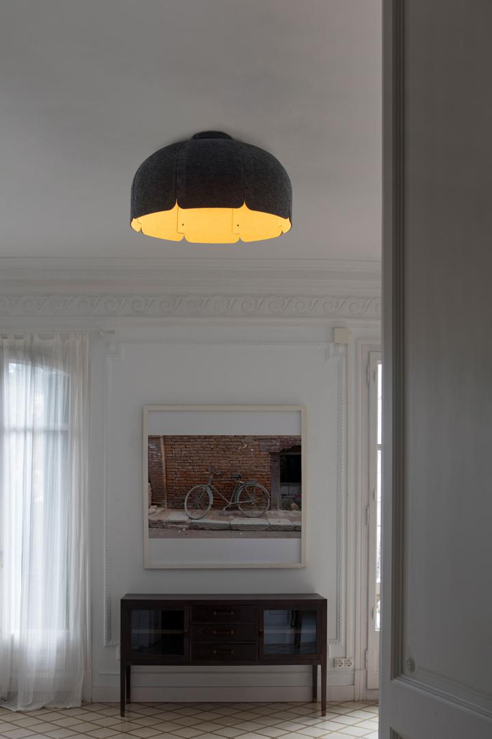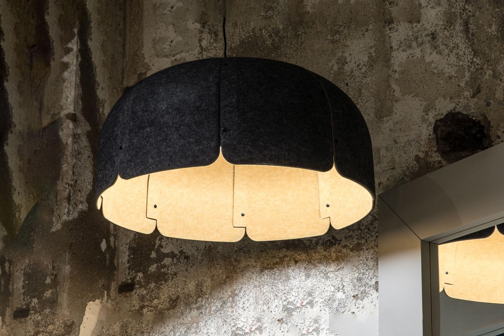 MUTE - дизайнерская подвесная лампа, созданная Nahtrang. Дисплей в коричнево-темно-серой версии уменьшает звуковую память, что делает его идеальным для освещения ресторанов или шумных помещений . Он состоит из 8 листов листов, и каждый лист состоит из 2 слоев акустического материала. Он изготовлен из переработанных бутылок на 65-70% и не содержащих ПЭТ волокон на 30-35%. Это версия с регулируемой яркостью, интенсивность света можно регулировать .