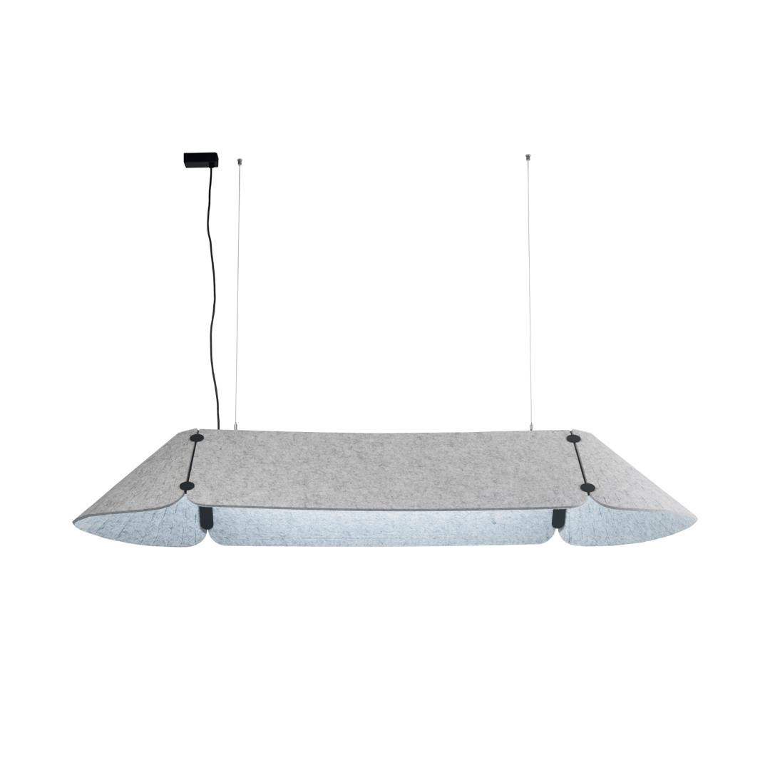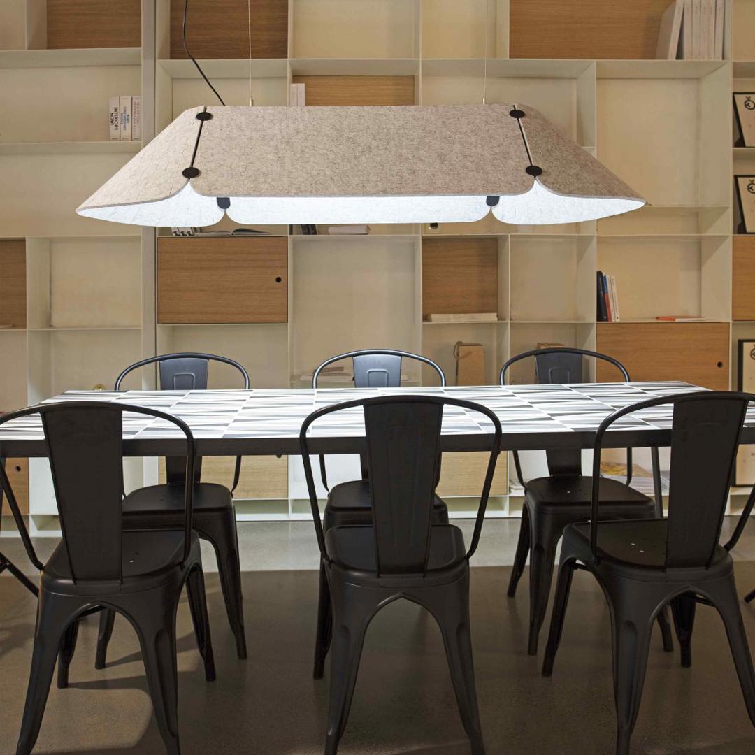 FONOVIA-это подвесной светильник технического ассортимента, который был разработан, чтобы принести тепло в рабочие пространства. Гибридный модульный продукт, который в дополнение к освещению функционирует как звукопоглощающая панель благодаря текстильным панелям. Идеальное дополнение для украшения и освещения офисов и открытых общих пространств.