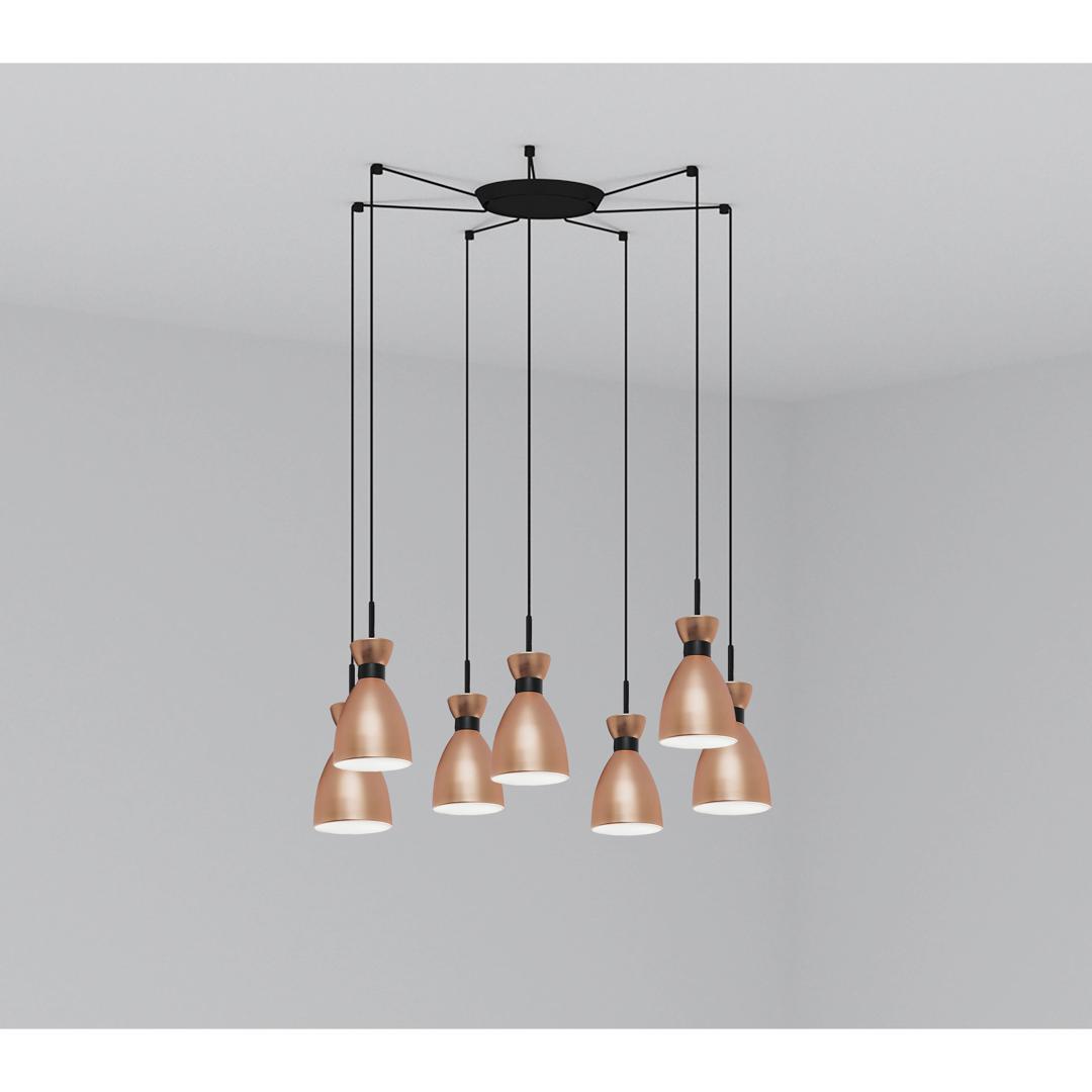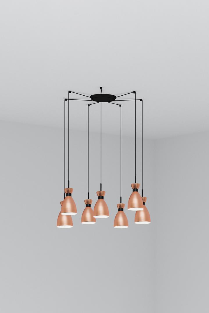 RETRO - это серия дизайнерских ламп от Alex & Manel Lluscà, вдохновленная 60-ми годами. С помощью этого подвесного светильника из меди вы можете осветить различные помещения в вашем доме. С этой серией вы получите ретро-атмосферу для домашнего освещения. Версия с несколькими потолочными розетками с 7 лампами.