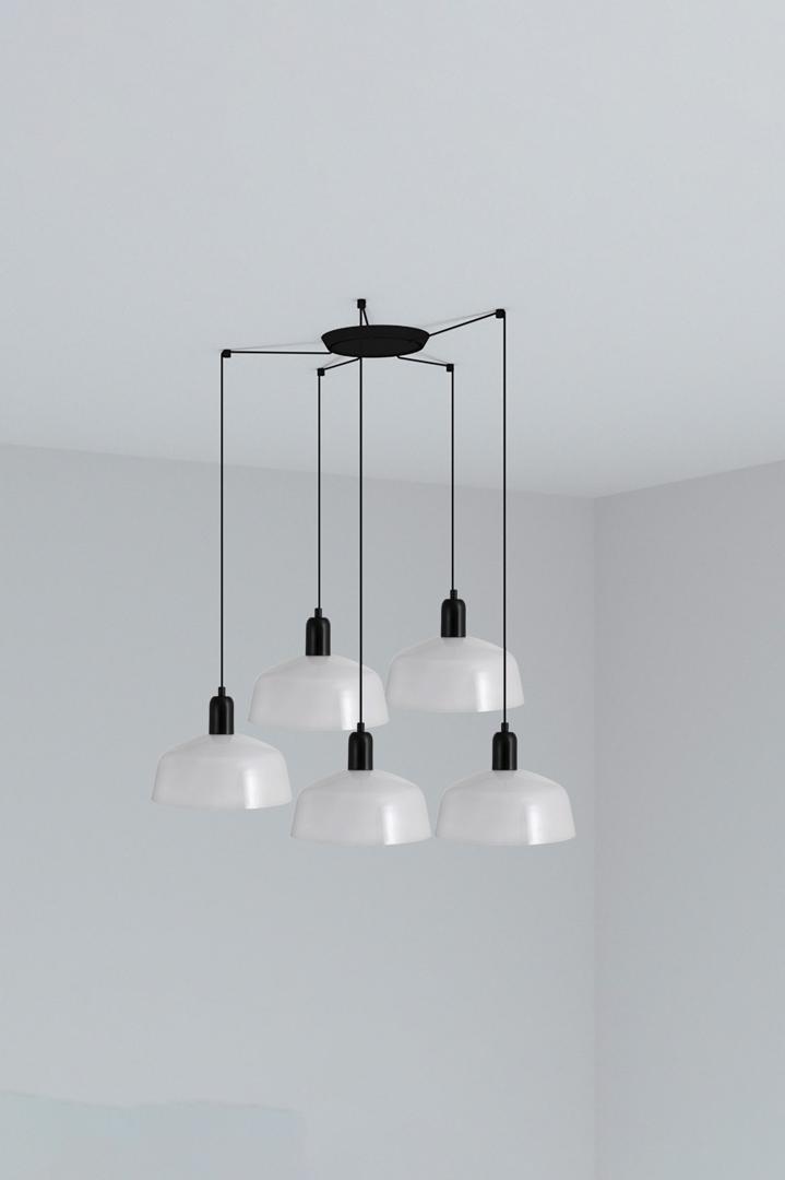 TATAWIN M — это семейство светильников, разработанное Адольфо Абейоном. Форма тени напоминает верхнюю часть характерных домов Татауина, города на юго-востоке Туниса. Он идеален для создания композиций из одной точки света как в контрактных помещениях, так и дома. Версия с абажуром из белого опалового стекла и несколькими потолочными розетками на 5 ламп.
