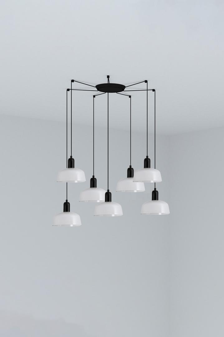 TATAWIN S — это семейство светильников, разработанное Адольфо Абейоном. Форма тени напоминает верхнюю часть характерных домов Татауина, города на юго-востоке Туниса. Он идеален для создания композиций из одной точки света как в контрактных помещениях, так и дома. Версия с абажуром из белого опалового стекла и несколькими потолочными розетками на 7 ламп.