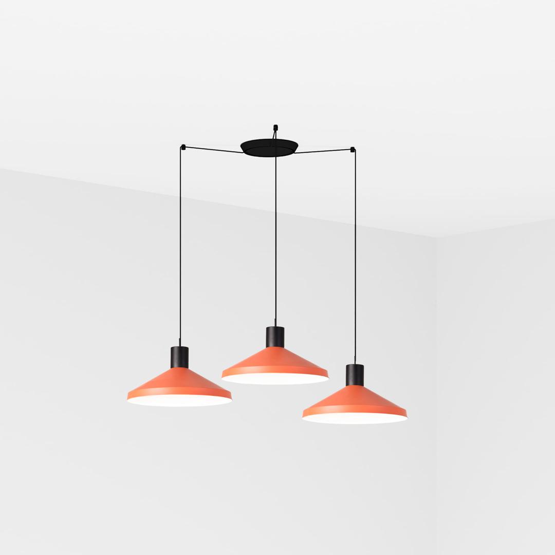 KOMBO — это семейство подвесных светильников, созданное Nutcreatives. Серия имеет разные размеры и отделку, которые имеют черную цилиндрическую структуру в верхней части. Абажур этого терракотового светильника выполнен из металла, выполнен в минималистском стиле и играет с геометрическими формами. Версия с 3 плафонами. Его диаметр составляет 40 см.