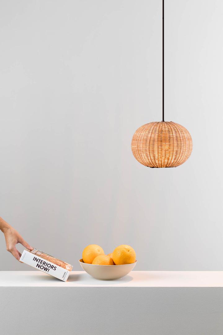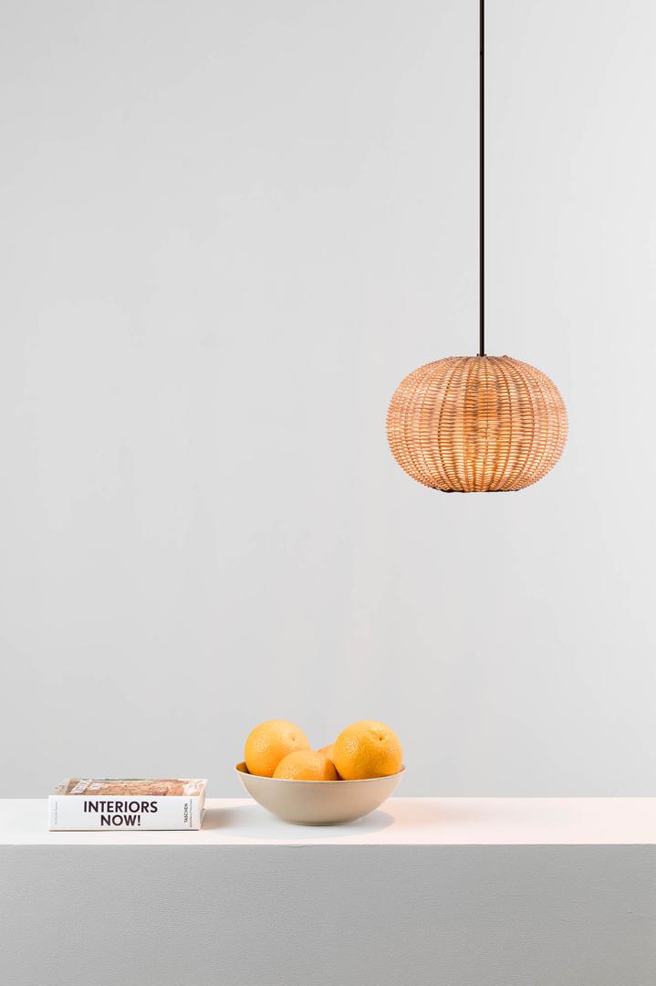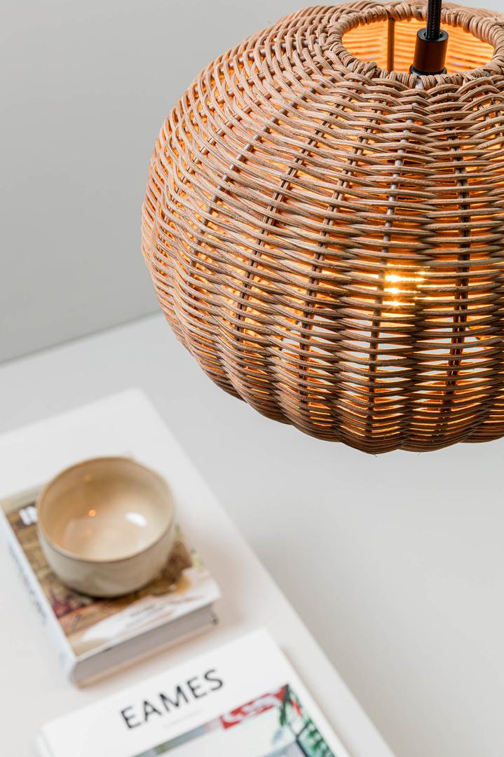 HAKA — круглый подвесной светильник в средиземноморском стиле. Свет проецируется через ротанг абажура, создавая красивый эффект. Он предназначен для освещения спален и гостиных и является хорошим выбором для отелей. Версия с абажуром 250 мм.