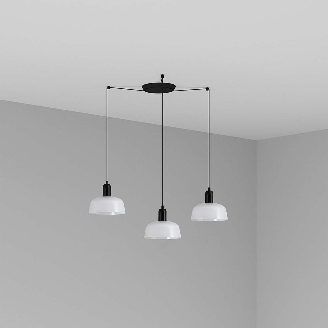 TATAWIN — это серия светильников, разработанная Адольфо Абейоном. Форма абажура напоминает верхнюю часть характерных домов Татауина, города, расположенного на юго-востоке Туниса. Этот подвесной светильник с черной конструкцией состоит из белого металлического абажура, который обеспечивает направленный свет.