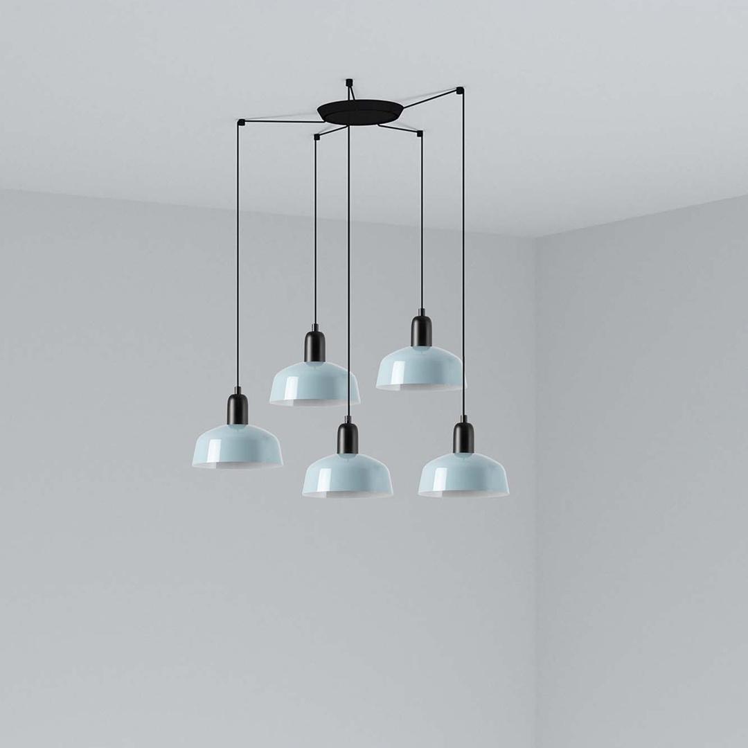 TATAWIN — это серия светильников, разработанная Адольфо Абейоном. Форма абажура напоминает верхнюю часть характерных домов Татауина, города, расположенного на юго-востоке Туниса. Этот подвесной светильник с черной конструкцией состоит из сине-серого металлического абажура, который обеспечивает направленный свет.