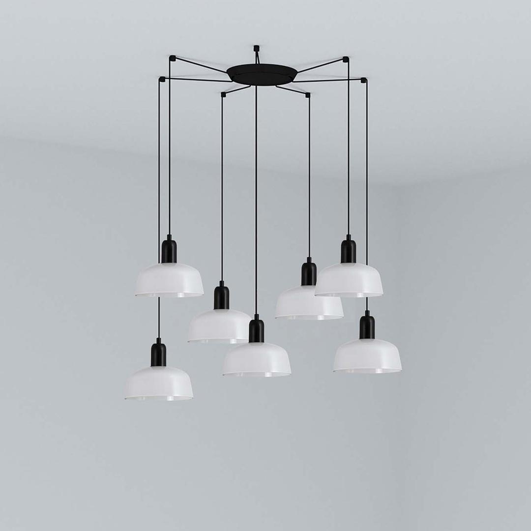 TATAWIN — это серия светильников, разработанная Адольфо Абейоном. Форма абажура напоминает верхнюю часть характерных домов Татауина, города, расположенного на юго-востоке Туниса. Этот подвесной светильник с черной конструкцией состоит из белого металлического абажура, который обеспечивает направленный свет.
