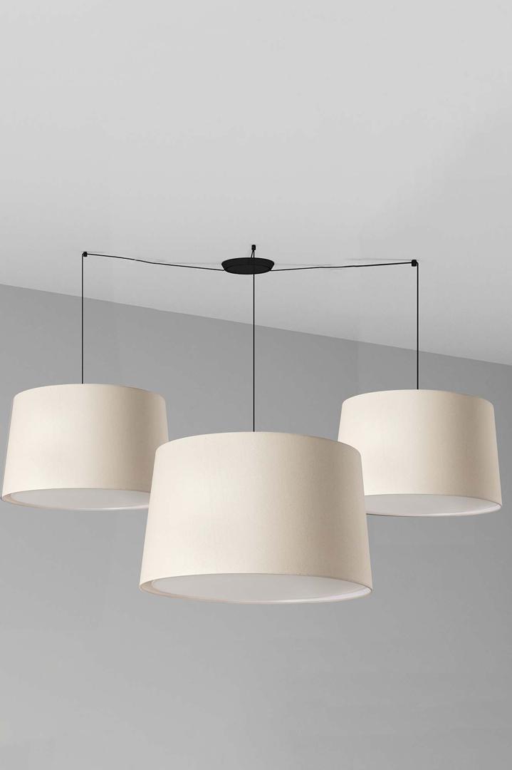 Очень большие абажуры для создания впечатляющего эффекта. WINDSOR — это коллекция светильников, разработанная Faro Lab. Этот черный подвесной светильник с льняным абажуром идеально подходит для помещений, где требуется рассеянное освещение.