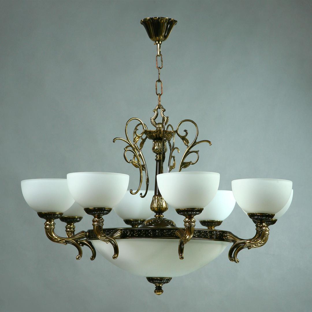 Люстра, выполненная из латуни в блестящей бронзовой отделке и абажурами из белого стекла.
