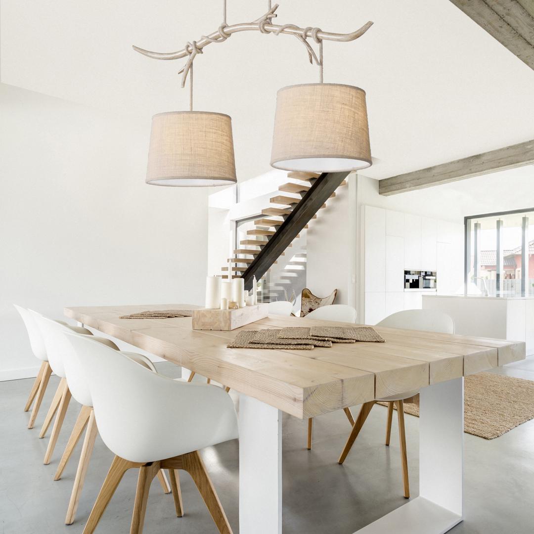 Коллекция Sabina, с мягкими простоватыми штрихами, имитирует текстуры и цвета дерева. Металлические конструкции, элементы, сочетающие абажуры из мешковины разных размеров и электрифицированные кабели с текстилем. Покрытие, имитирующее канат, поддерживает элементы в воздухообразующих композициях разных форматов, шнурованных простыми узлами в деревенском стиле.