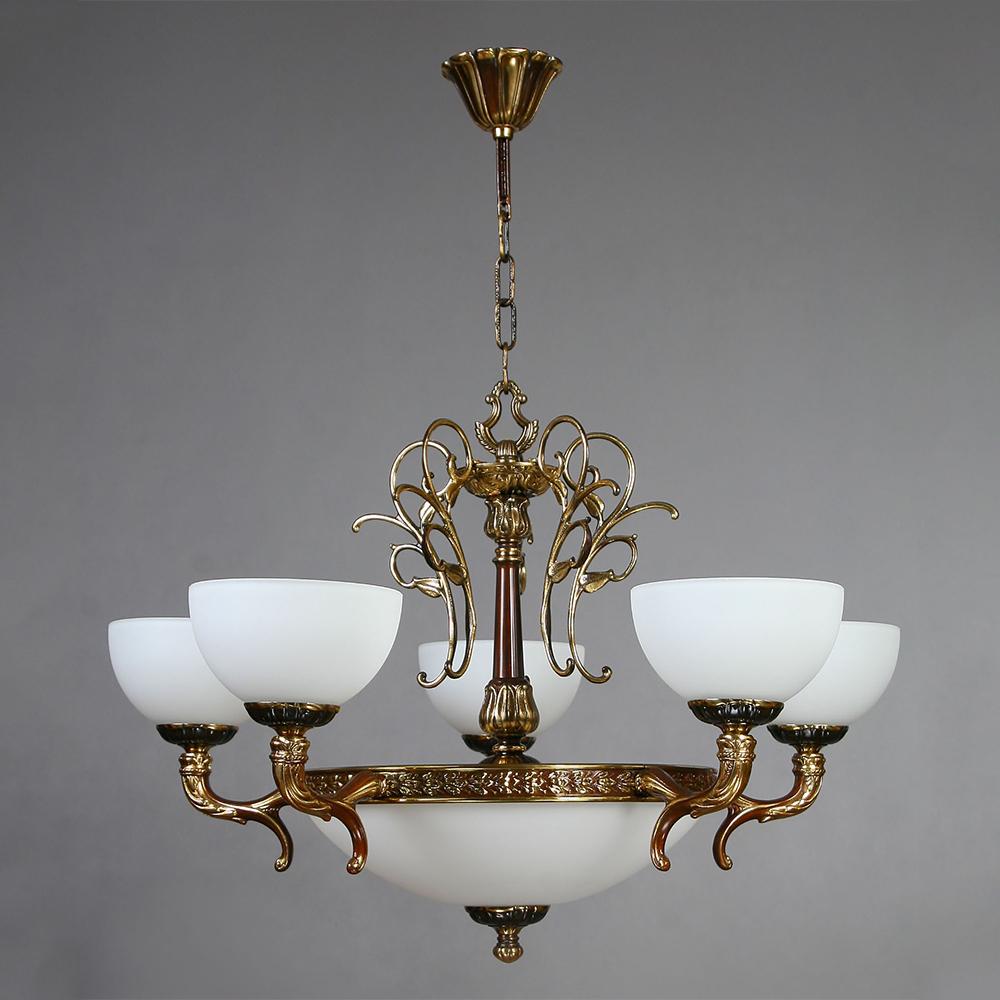 Люстра, выполненная из латуни в блестящей бронзовой отделке и абажуром из белого стекла.