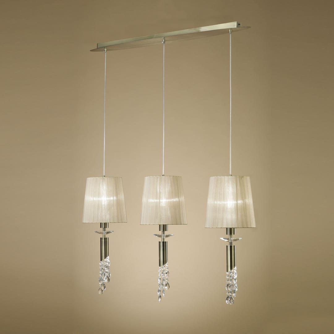 Tiffany - это роскошная коллекция освещения, которая придает элегантность любому помещению. Прозрачность абажуров вместе с блестками стеклянных камней делают этот светильник предметом, который освещает и в то же время украшает помещение. Поставляется в двух вариантах отделки; хром с плафонами из белой шелковой ткани или античная бронза с плафонами кремового цвета.