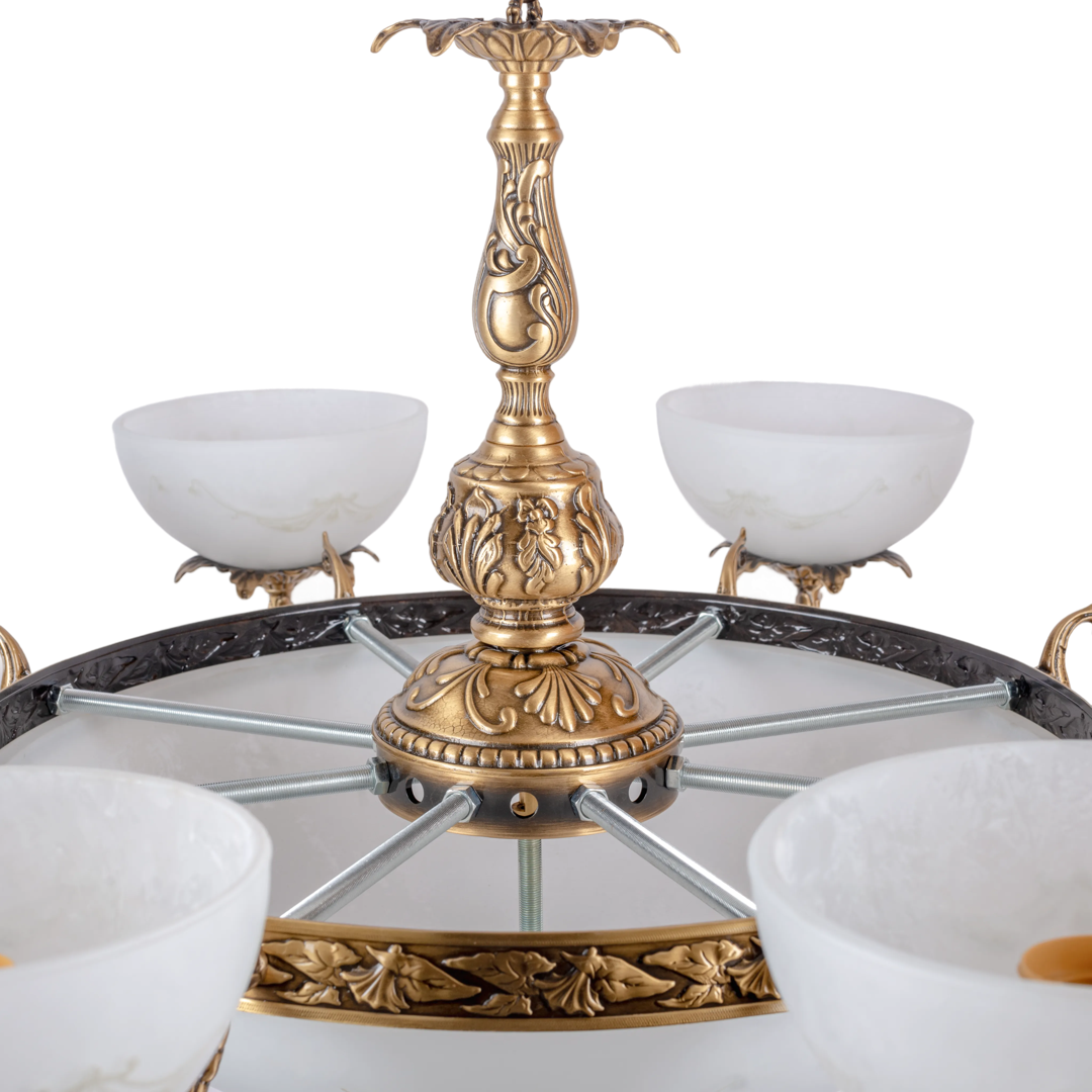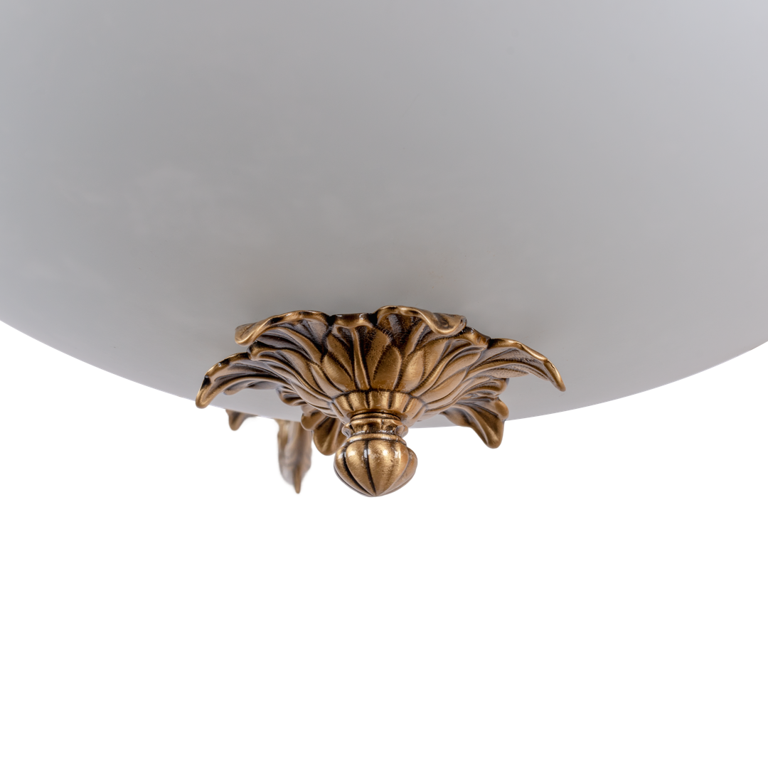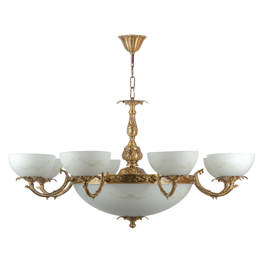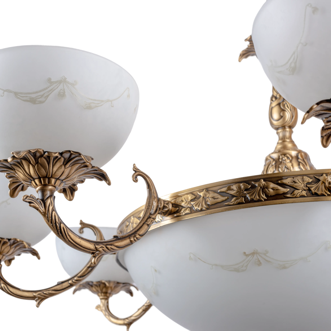 Люстра, выполненная из латуни в матовой бронзовой отделке и абажурами из белого стекла.