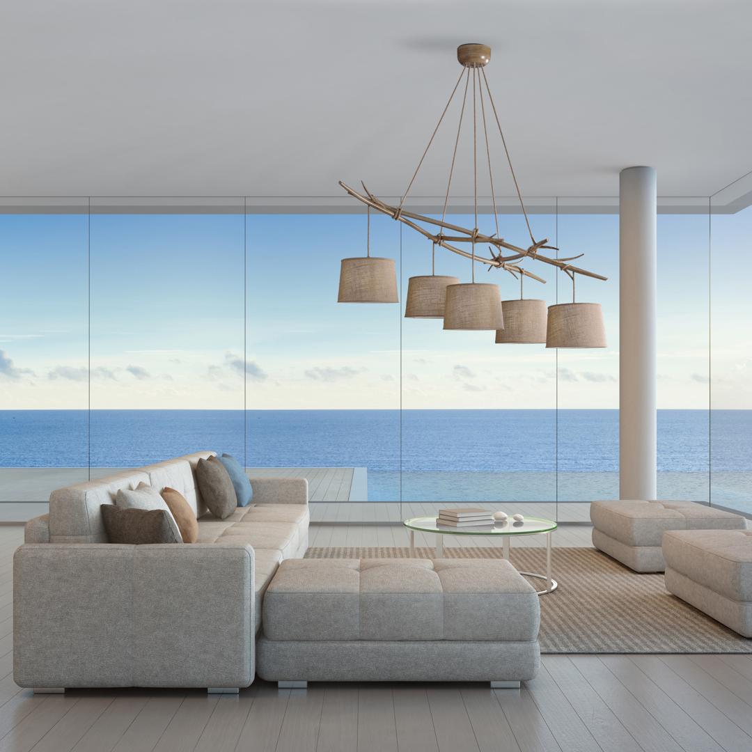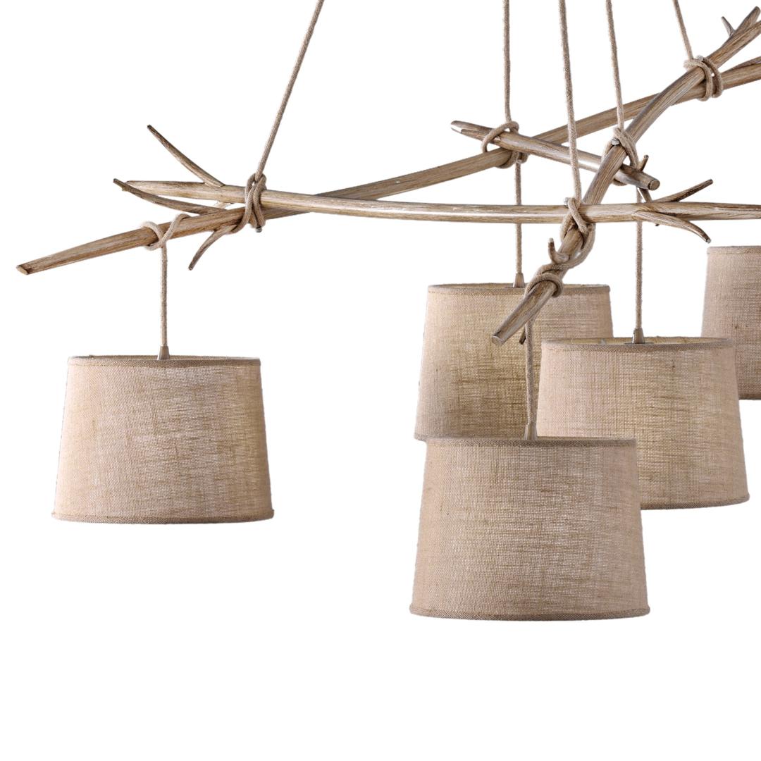 Коллекция Sabina, с мягкими простоватыми штрихами, имитирует текстуры и цвета дерева. Металлические конструкции, элементы, сочетающие абажуры из мешковины разных размеров и электрифицированные кабели с текстилем. Покрытие, имитирующее канат, поддерживает элементы в воздухообразующих композициях разных форматов, шнурованных простыми узлами в деревенском стиле.