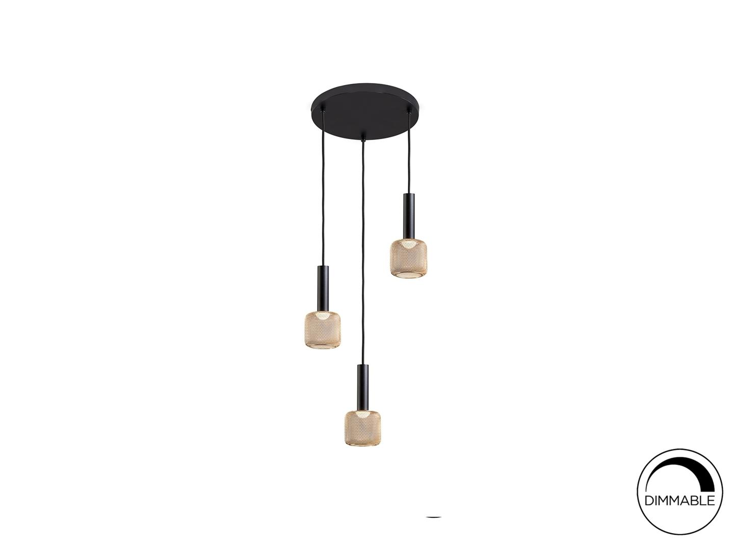 3-х ламповый светодиодный светильник из матового черного металла и абажура из металлической блестящей металлической сетки, рассеиватель из опалового акрила. Светодиод 15 Вт, 1350 лм, 3000 К. С возможностью затемнения.