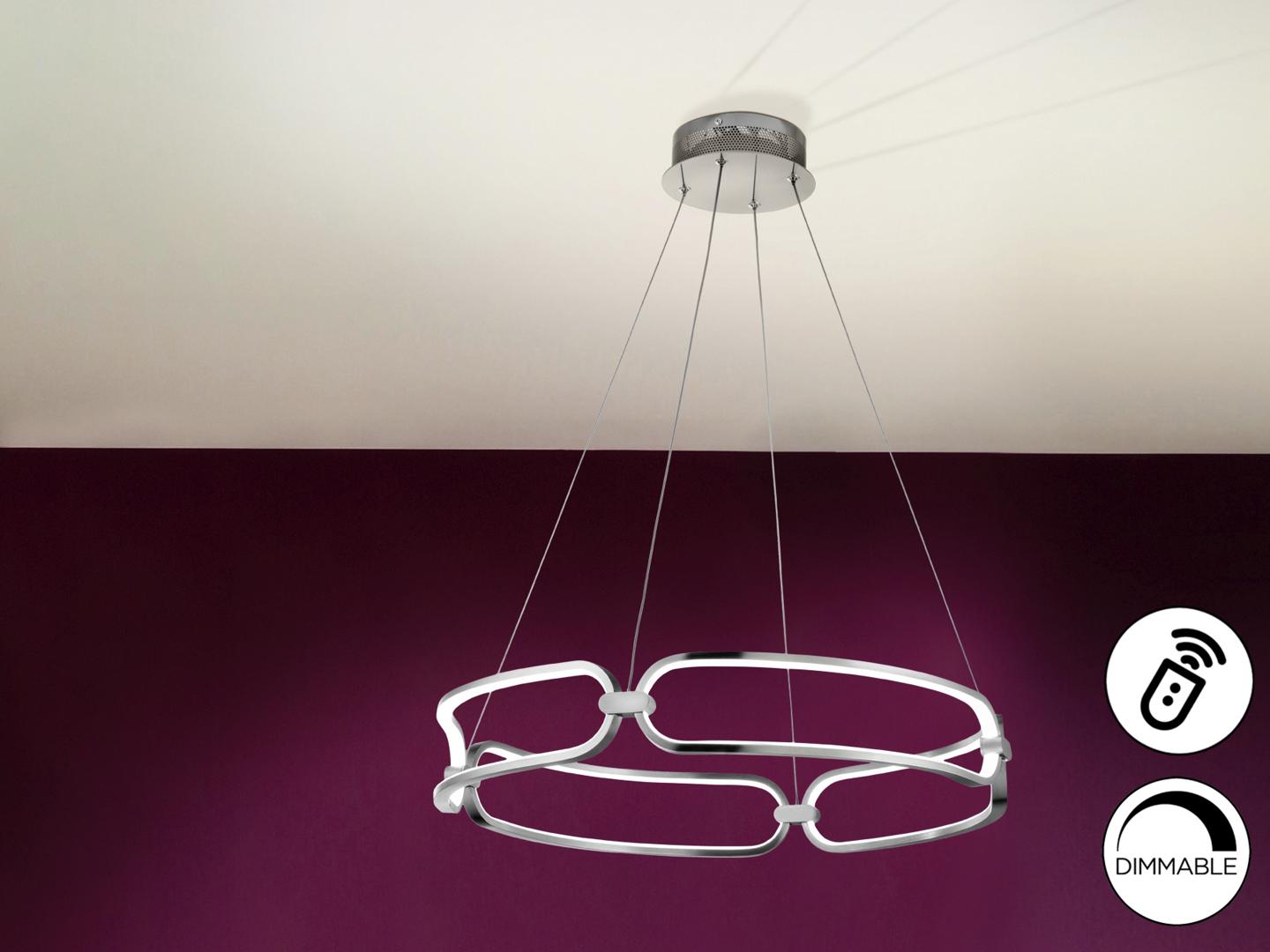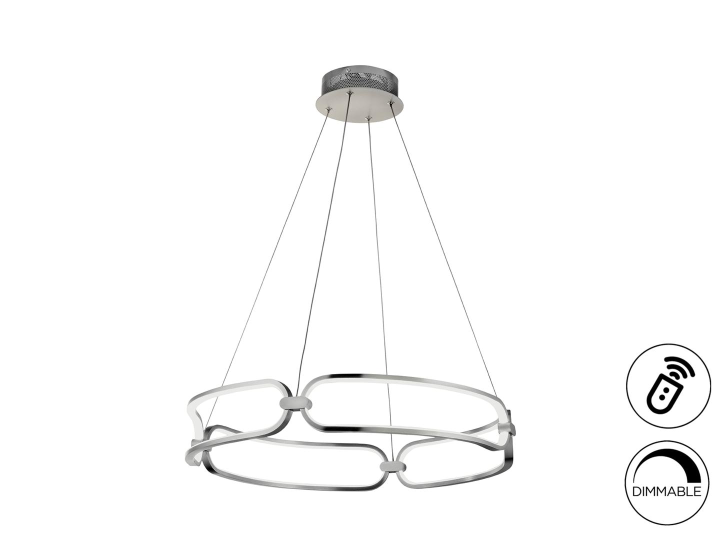 Светодиодная лампа из алюминия с хромированным покрытием. Регулируется по высоте. Опаловые силиконовые диффузоры. Светодиод 54 Вт, 4860 лм, 3000 К. С возможностью затемнения. Включает пульт дистанционного управления. Этот продукт включает драйверы светодиодов с диммером 0-10 В или ШИМ, приемник и радиочастотный пульт дистанционного управления. Для использования с настенным регулятором используйте только диммеры этих двух типов регулирования. Диммер другого типа может повредить драйвер светодиода.