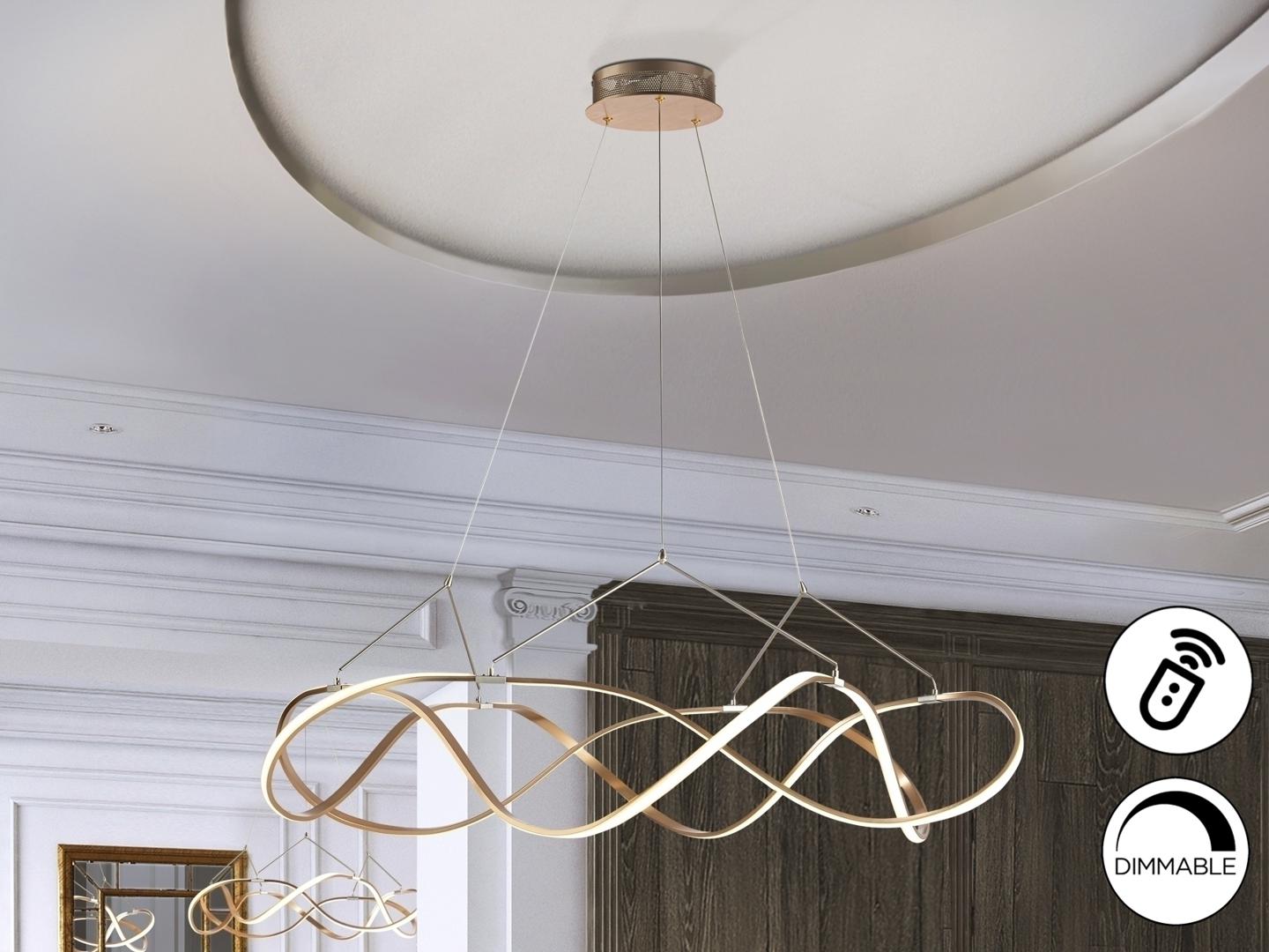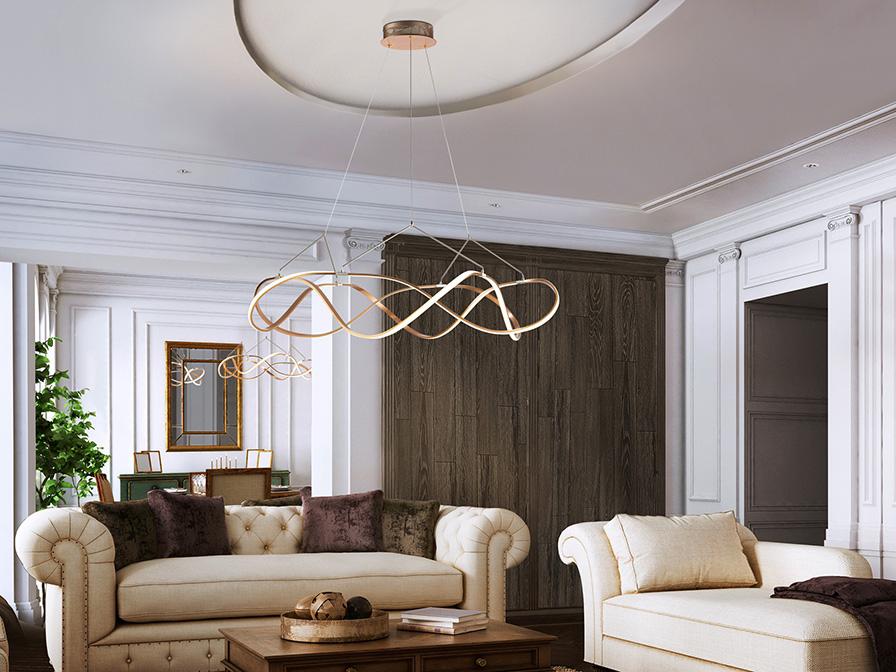 Светодиодная лампа из полированного алюминия, отделка розовым золотом, с хромированными деталями. Регулируется по высоте. Опаловые силиконовые диффузоры. Светодиод 63 Вт, 5670 лм, 3000 К. С возможностью затемнения. Включает пульт дистанционного управления. Этот продукт включает драйверы светодиодов с диммером 0-10 В или ШИМ, приемник и радиочастотный пульт дистанционного управления. Для использования с настенным регулятором используйте только диммеры этих двух типов регулирования. Диммер другого типа может повредить драйвер светодиода.
