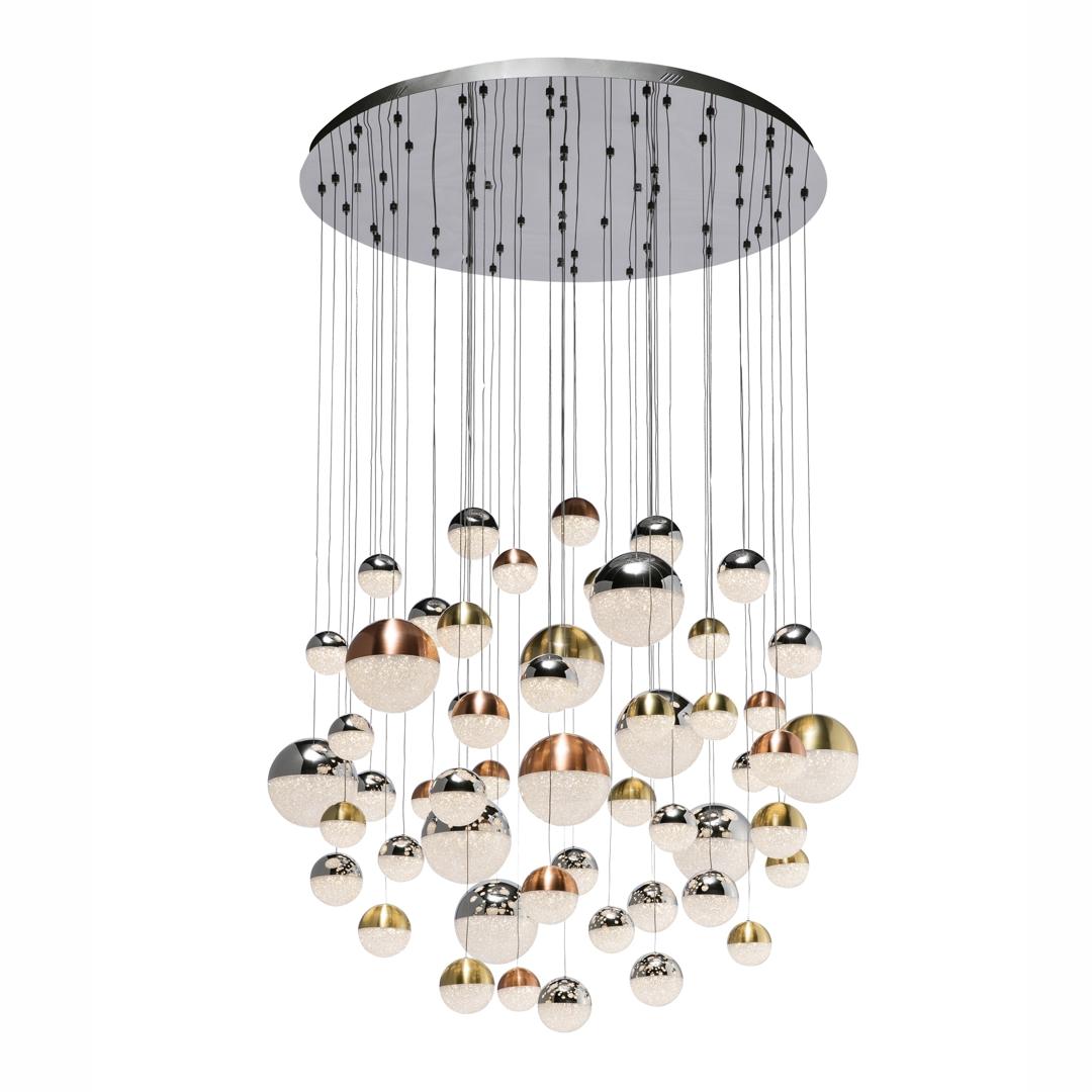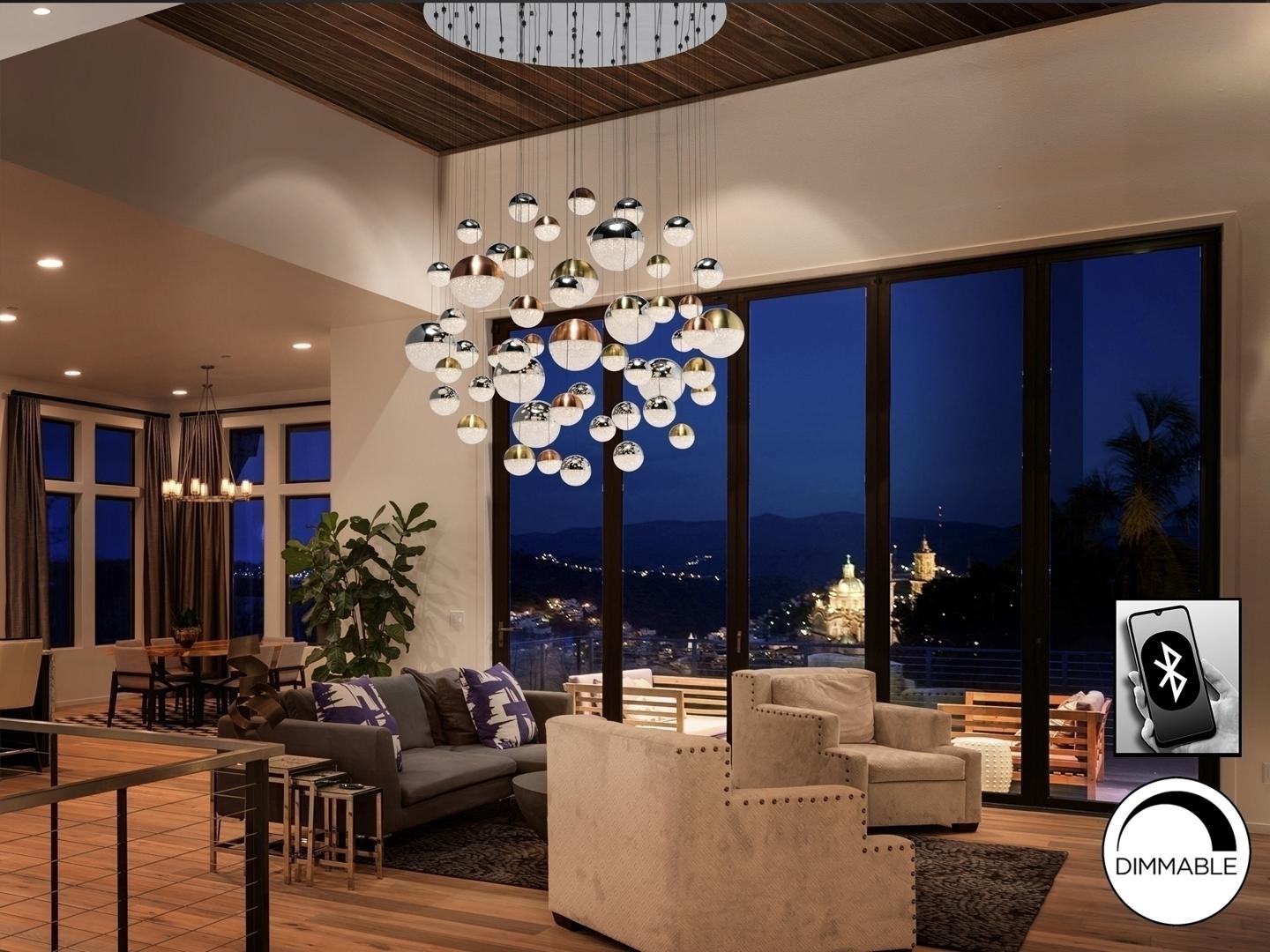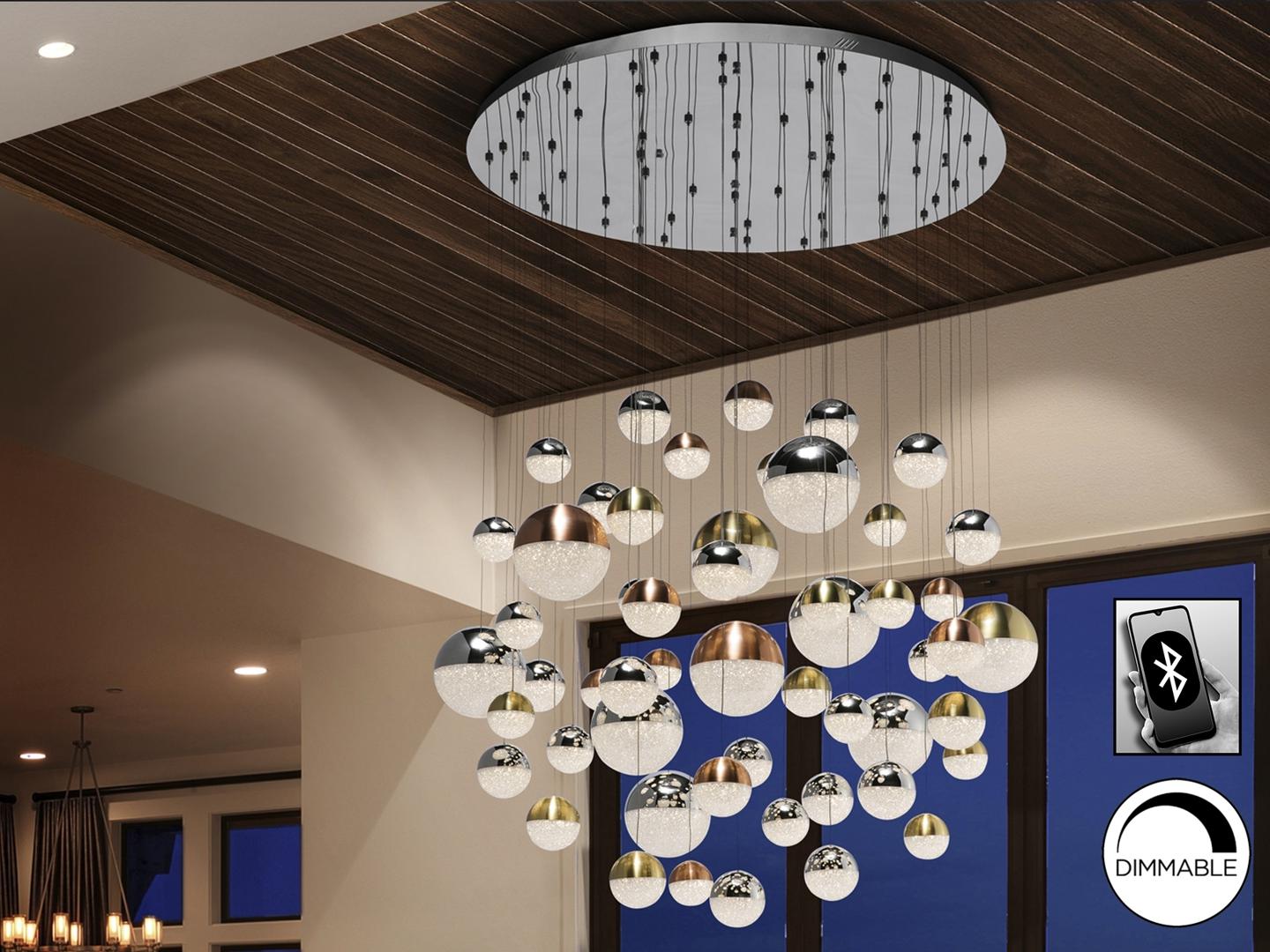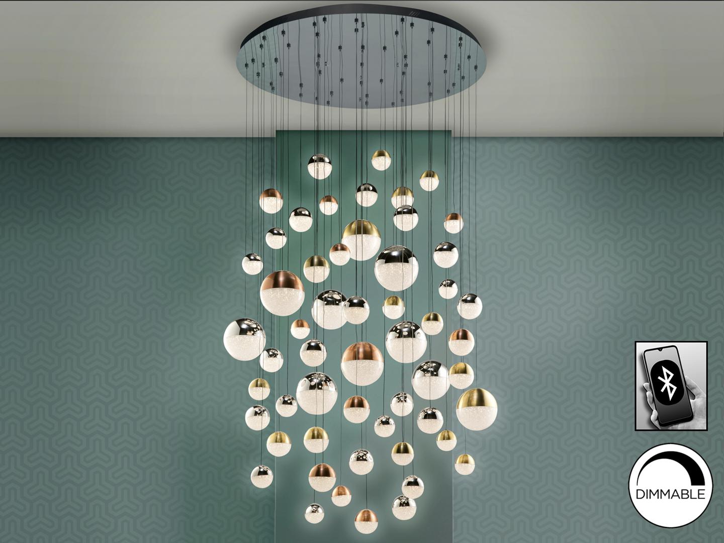 Лампа БОЛЬШОГО ФОРМАТА из хромированного металла, 55 светодиодов. Абажуры Ø10, 12 и 20 см, из поликарбоната, текстурированная внутренняя часть и металл из меди, сатинированной латуни и хрома. С УСТРОЙСТВОМ BLUETOOTH, с приложением для смартфона. Светодиод 288Вт, 3000K, 18720 лм. Включает светодиодный драйвер с диммером Bluetooth для использования через мобильное приложение или планшет. Также через интеллектуальный динамик, такой как Google Home или Amazon Echo, если добавлено устройство Bluetooth Gateway. Он несовместим с настенным регулятором. Регулируемая высота абажура для различных презентаций. Эта лампа также изготавливается в специальных размерах и отделках. Уточняйте цену и сроки доставки.