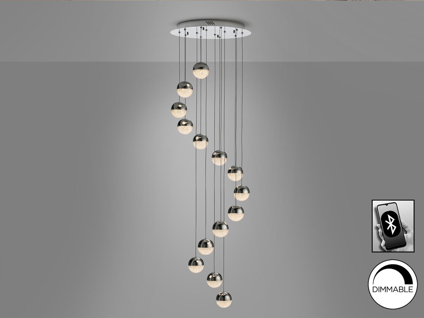 Лампа с 14 светодиодами. Изготовлен из металла с хромированным покрытием. Сферические абажуры Ø10 см из поликарбоната с текстурированной внутренней поверхностью и хромированного металла. Регулируемая высота. ЗАКРЫТИЕ ПО BLUETOOTH с помощью ПРИЛОЖЕНИЯ для смартфона. Светодиод 50Вт. 3000К. 3024 лм. Включает светодиодный драйвер с диммером Bluetooth для использования через мобильное приложение или планшет. Также через умный динамик, такой как Google Home или Amazon Echo, если добавлено устройство Bluetooth Gateway. Он несовместим с настенным регулятором.